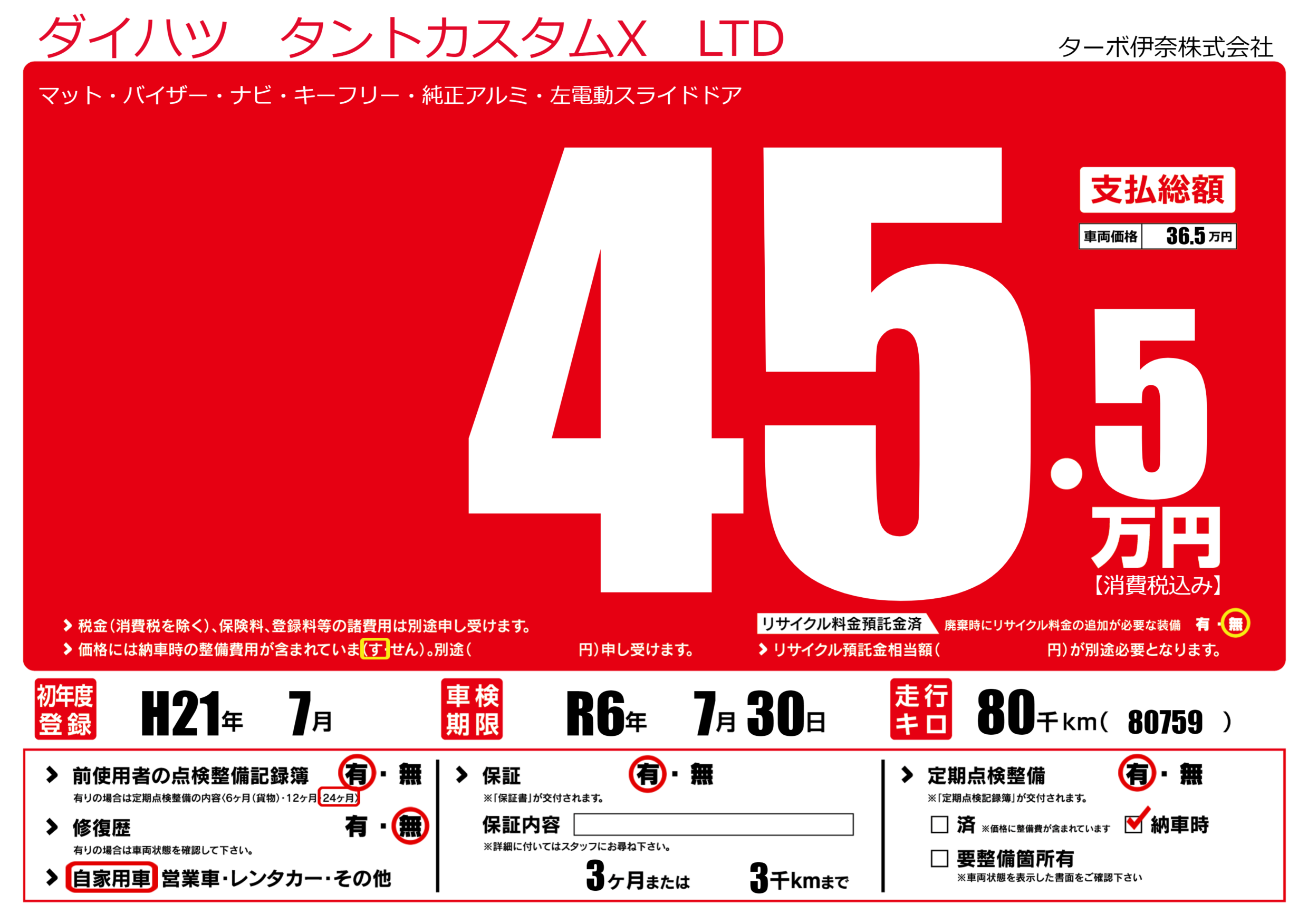 | 走行キロ | 8万km | 初年度登録 | H21年7月 |