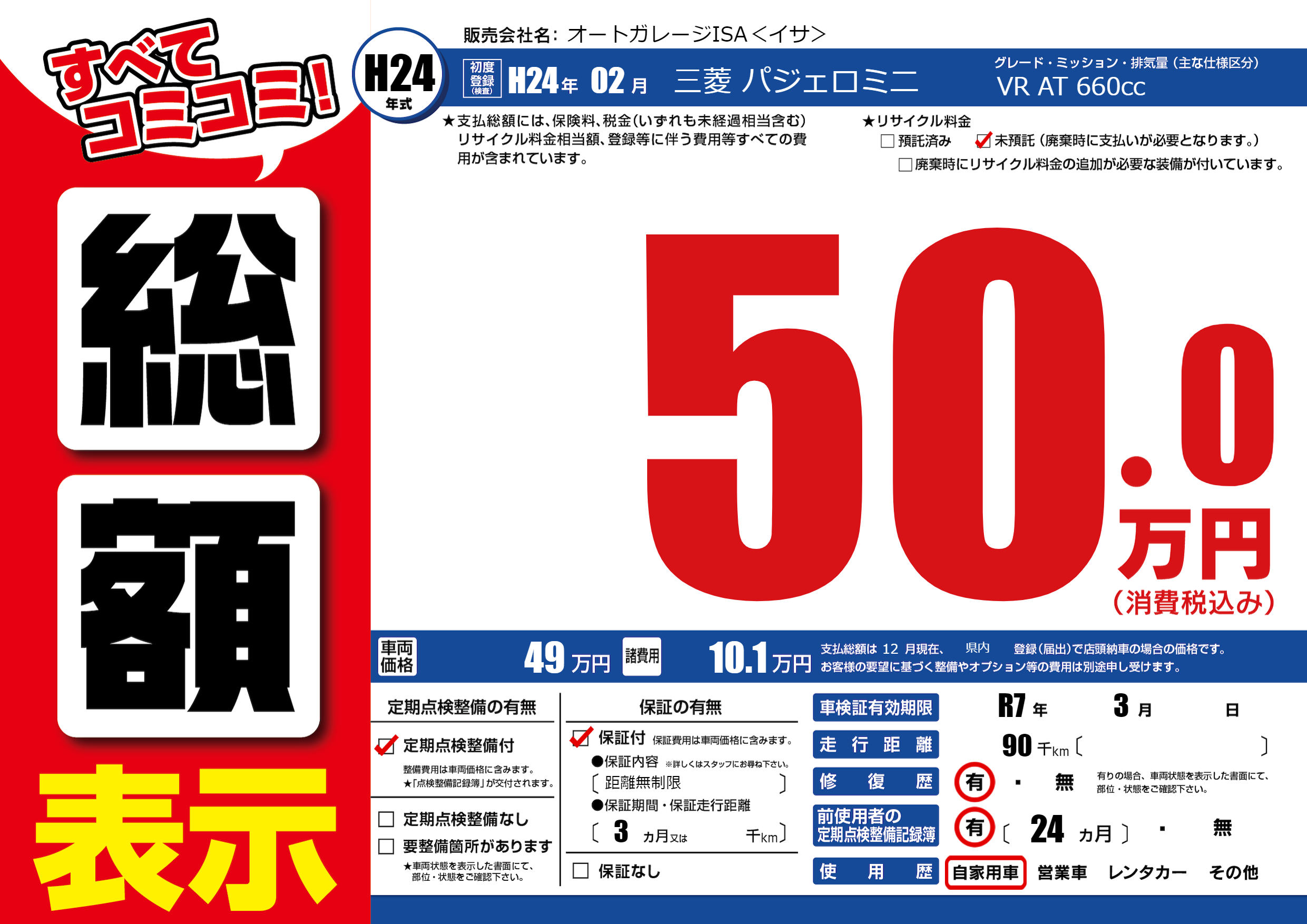 | 車名 | 三菱 パジェロミニ | グレード ミッション 排気量 |