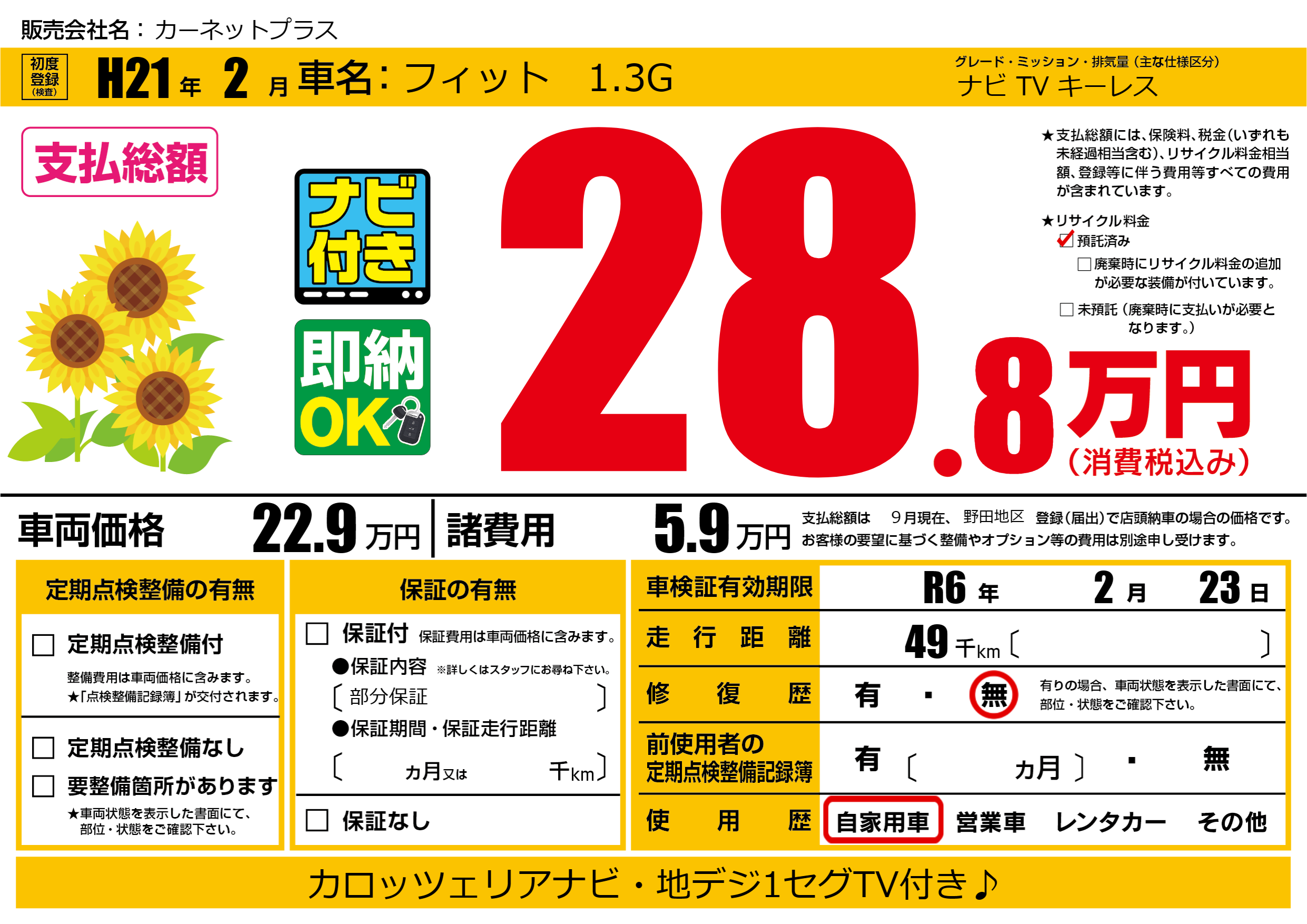 | 車名 | フィット 1.3G | グレード ミッション 排気量 |
