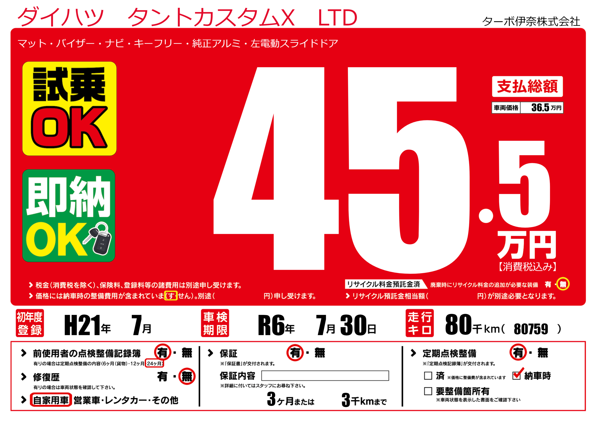 | 走行キロ | 8万km | 初年度登録 | H21年7月 |