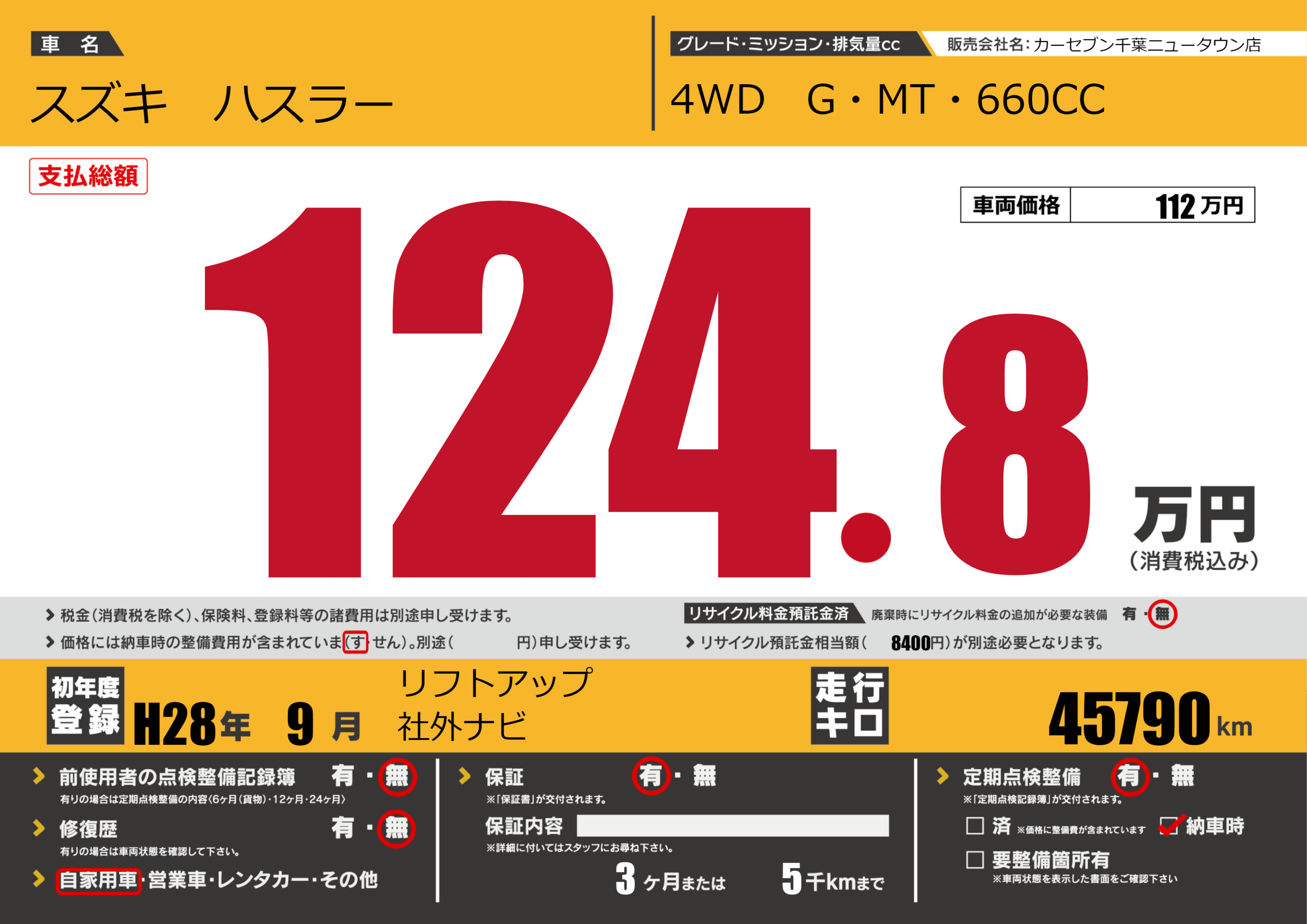 | 車名 | スズキ ハスラー | グレード ミッション 排気量 |