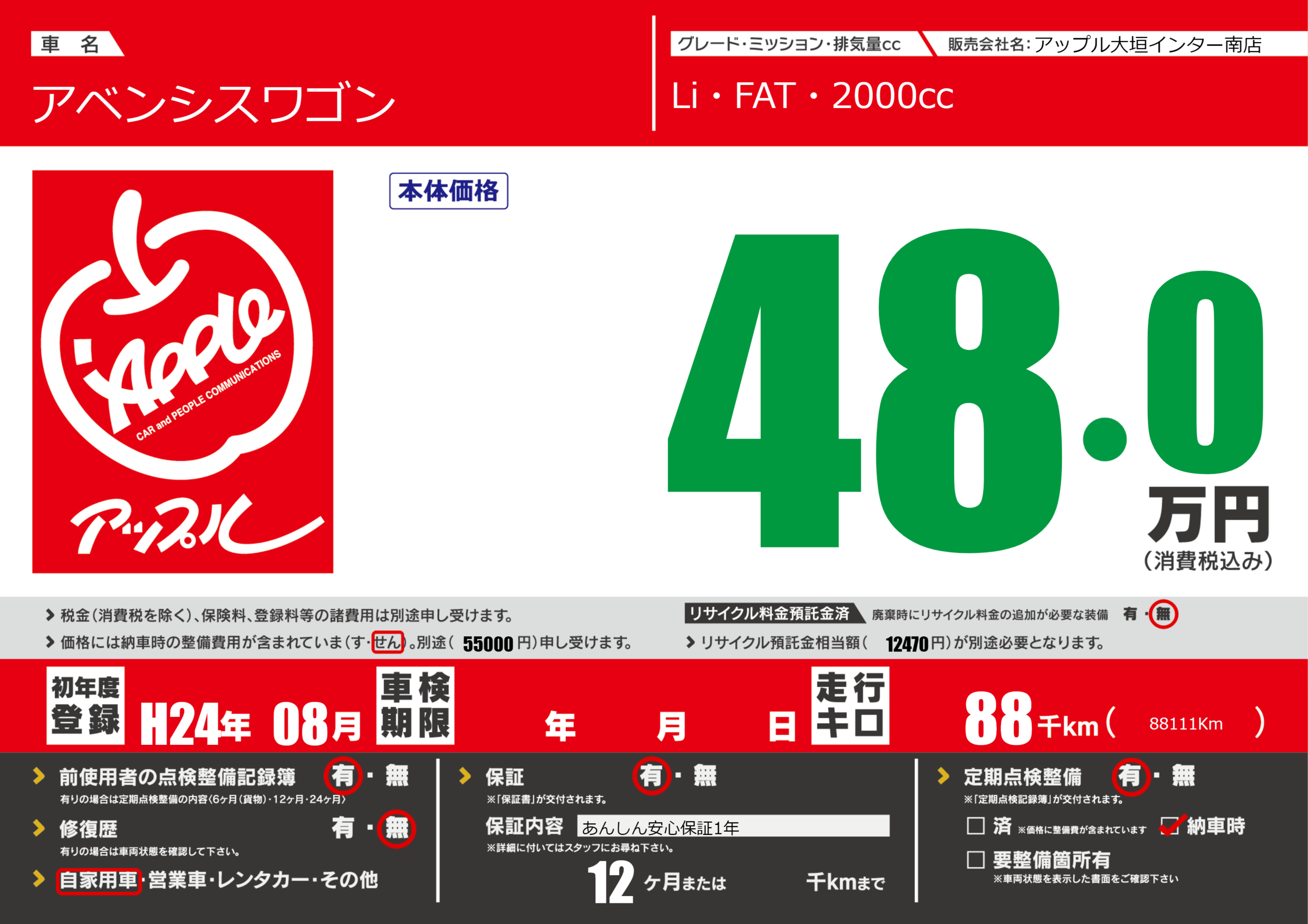 保証付き 保証内容(あんしん安心保証1年) 12ヶ月または()千kmまで |