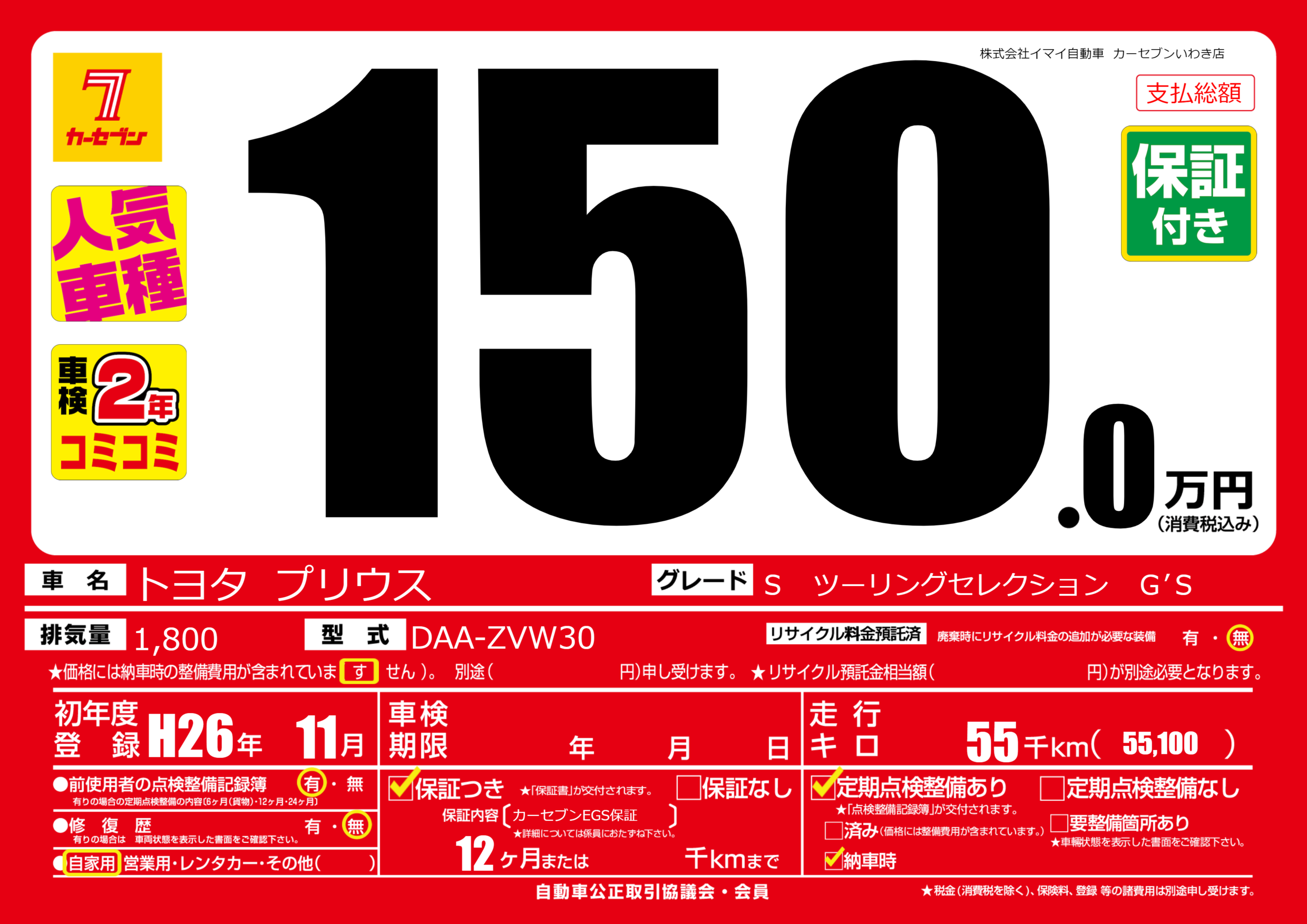 | 車名 | トヨタ プリウス | グレード ミッション 排気量 |