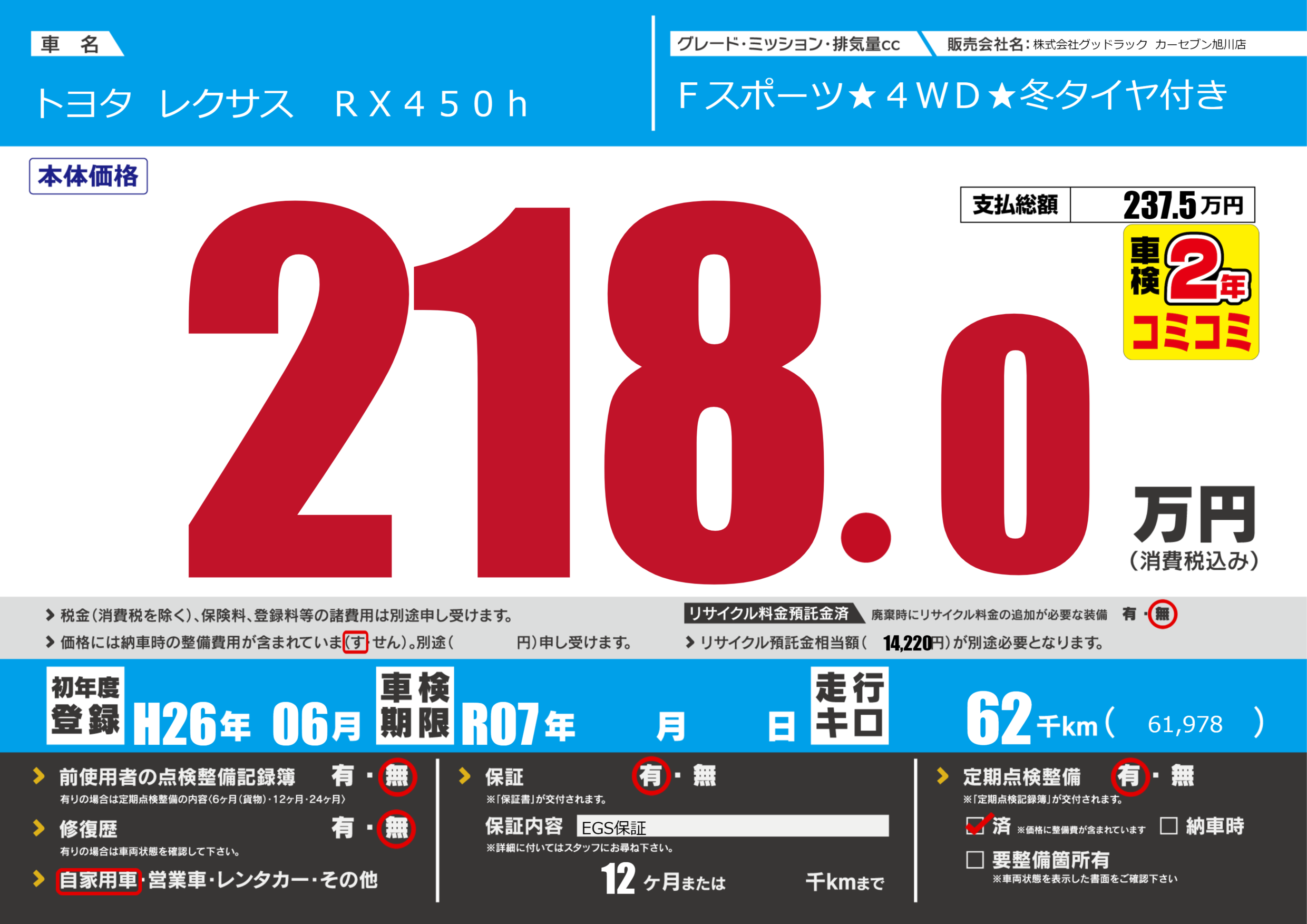 | 車名 | トヨタ レクサス RX450h | グレード ミッション 排気量 |