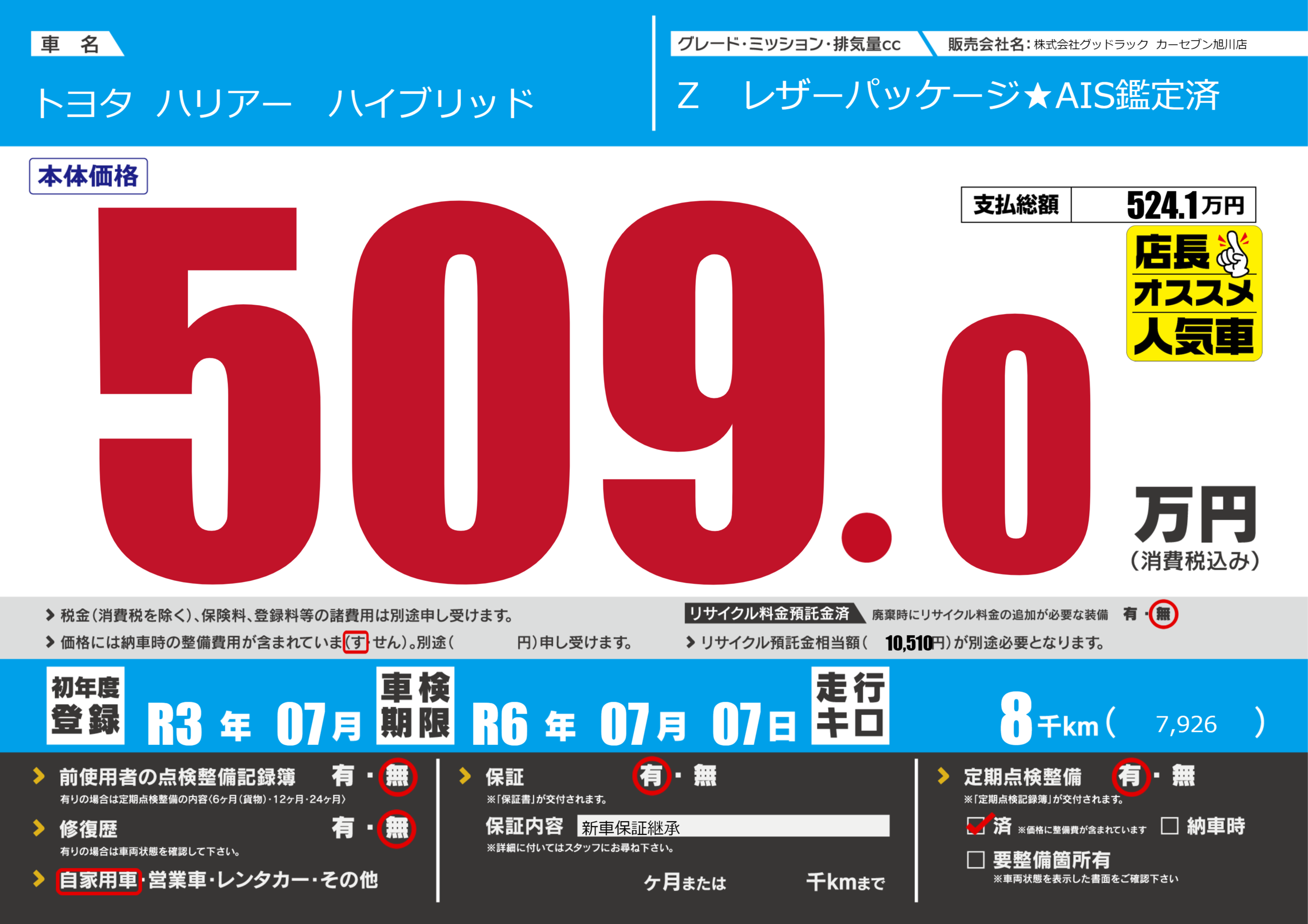 | 定期点検整備 | 定期点検整備あり 定期点検整備済み | ||