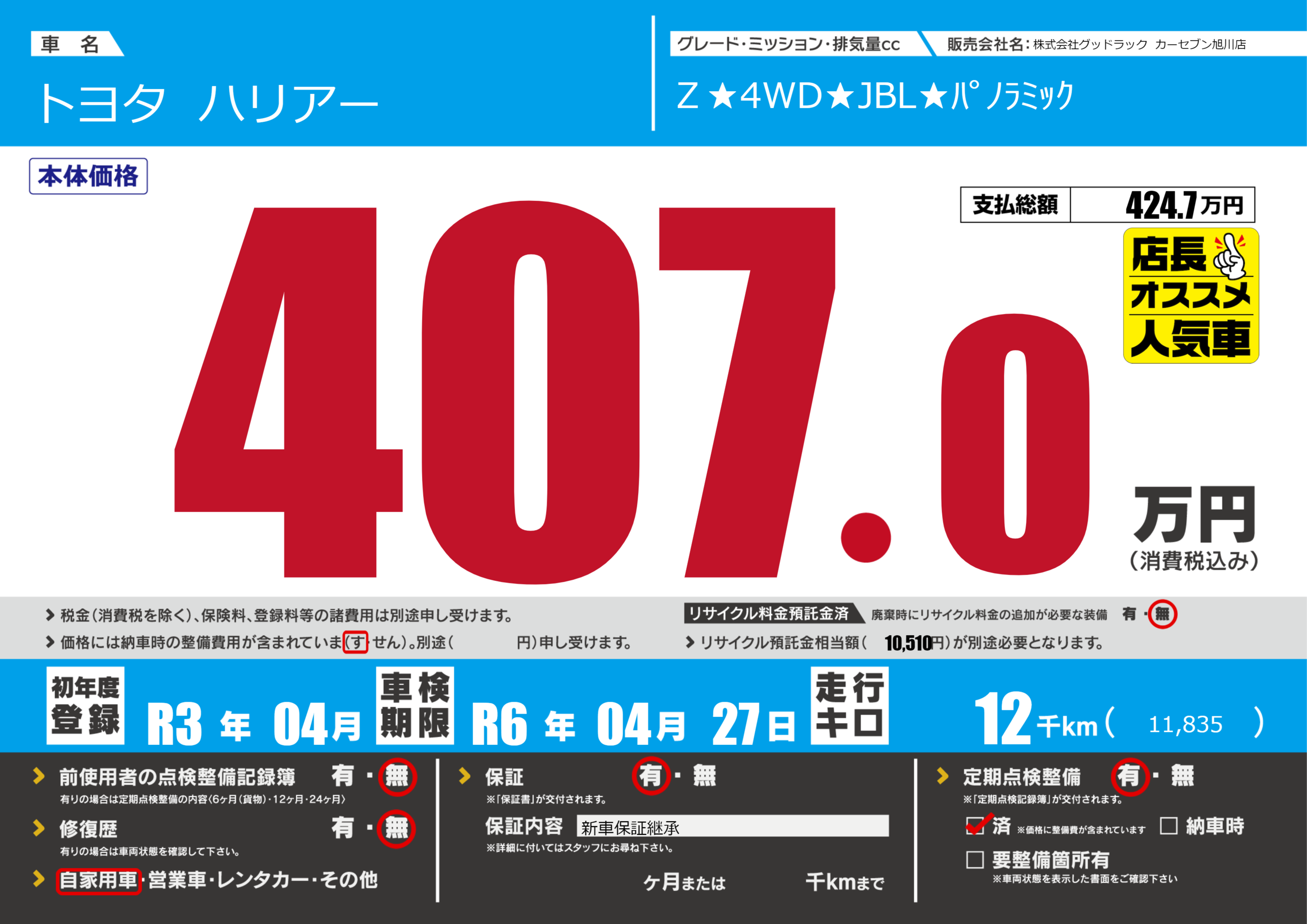 | 定期点検整備 | 定期点検整備あり 定期点検整備済み | ||