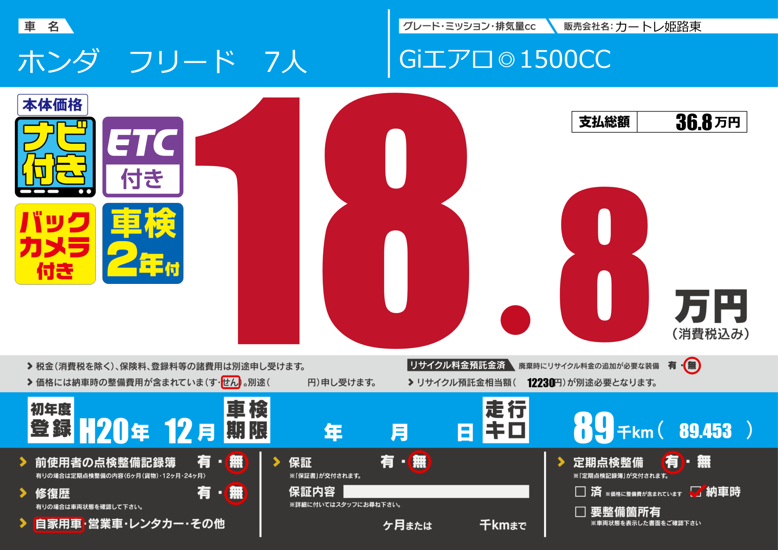 | 車名 | ホンダ フリード 7人 | グレード ミッション 排気量 |