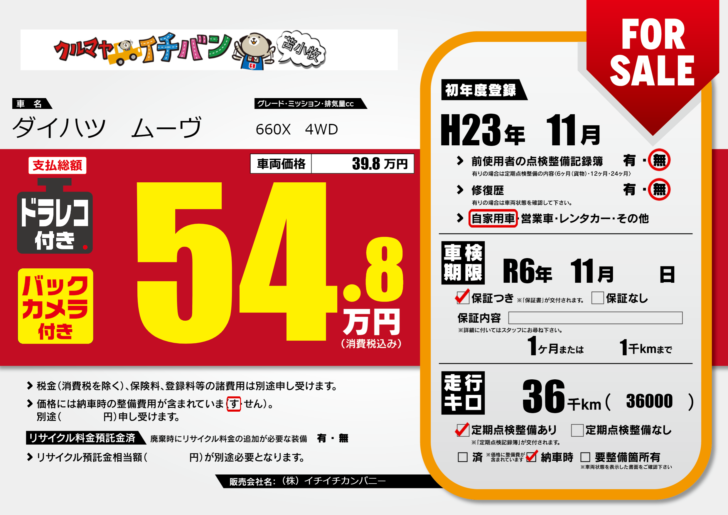 | 走行キロ | 3.6万km | 初年度登録 | H23年11月 |