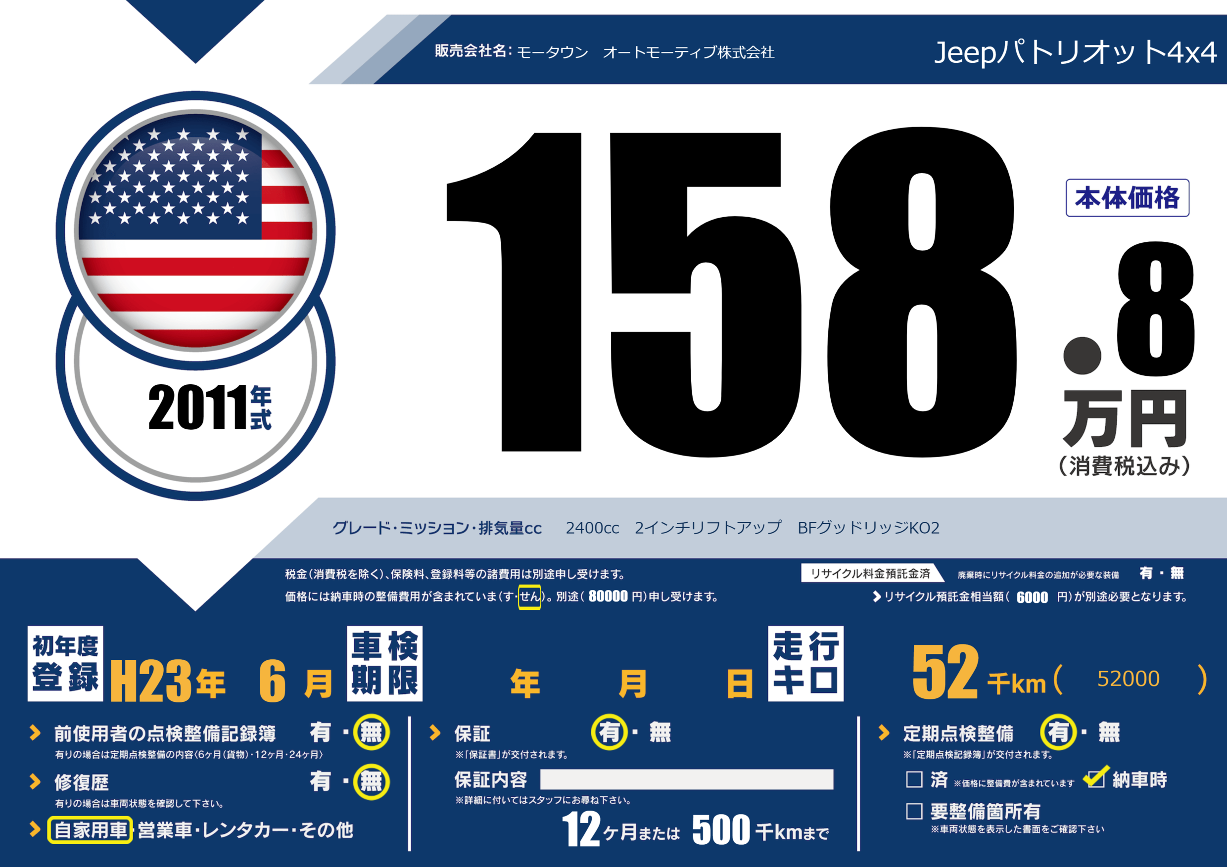 | 車名 | Jeepパトリオット4x4 | グレード ミッション 排気量 |