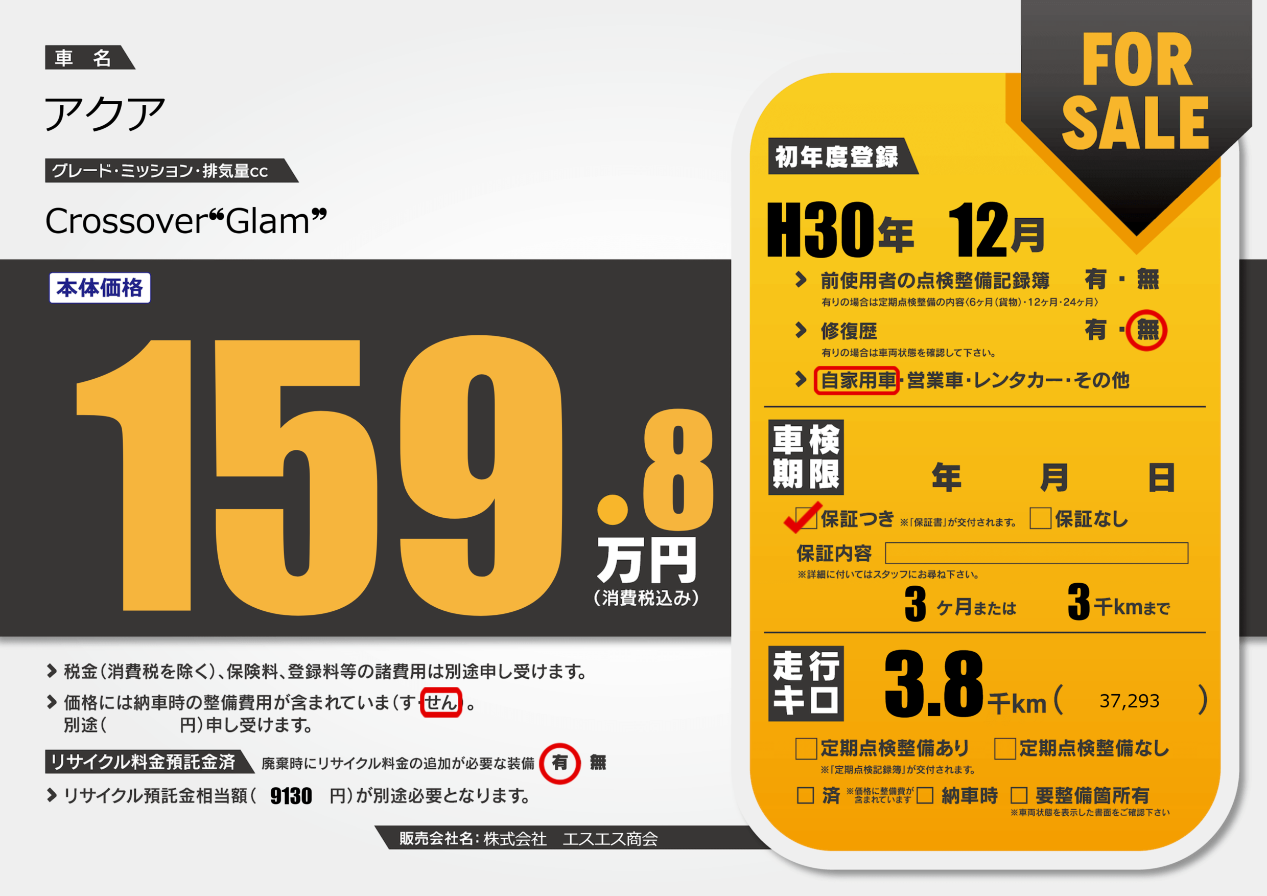 | 走行キロ | 0.3万km | 初年度登録 | H30年12月 |