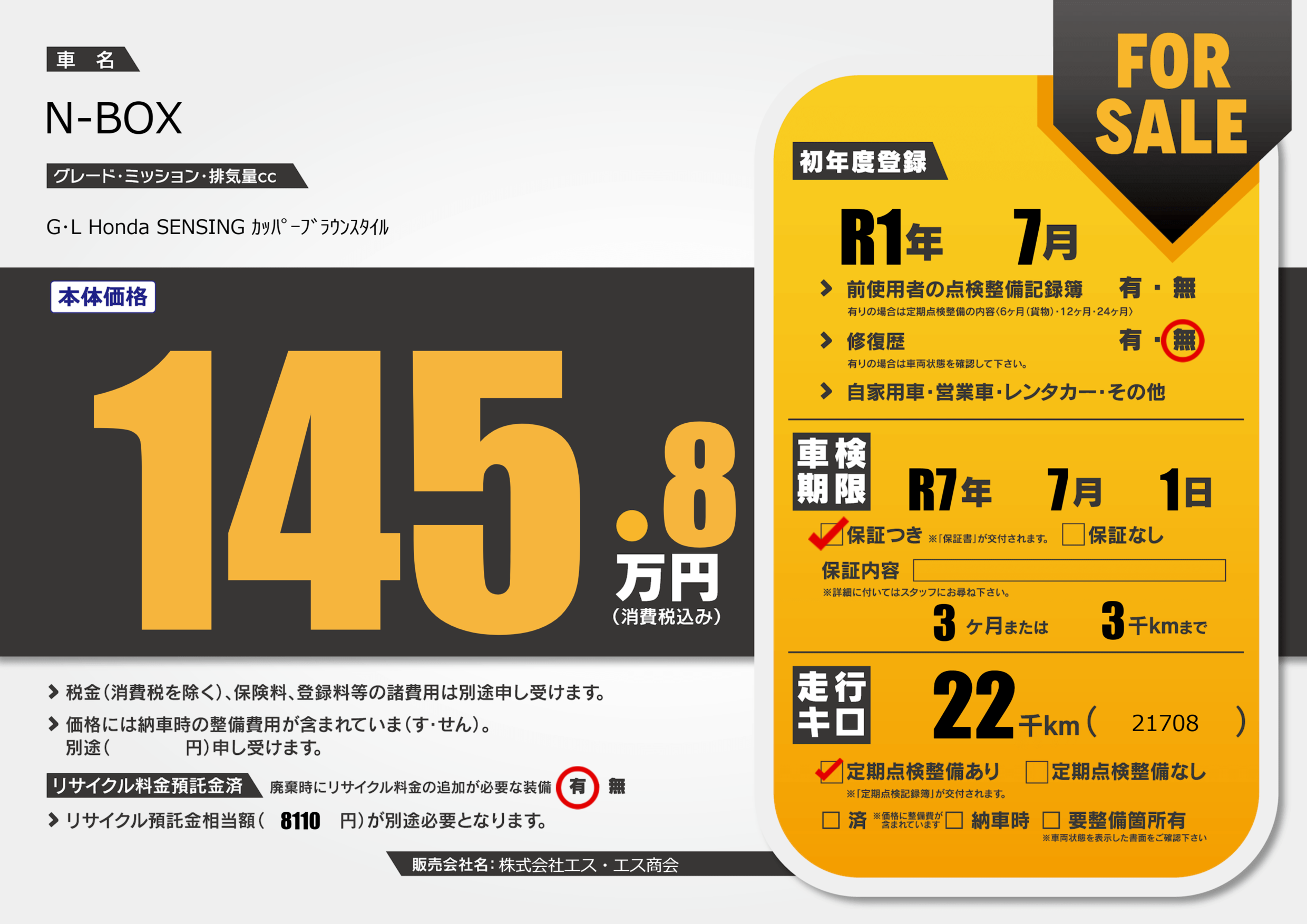 | 車名 | N-BOX | グレード ミッション 排気量 |
