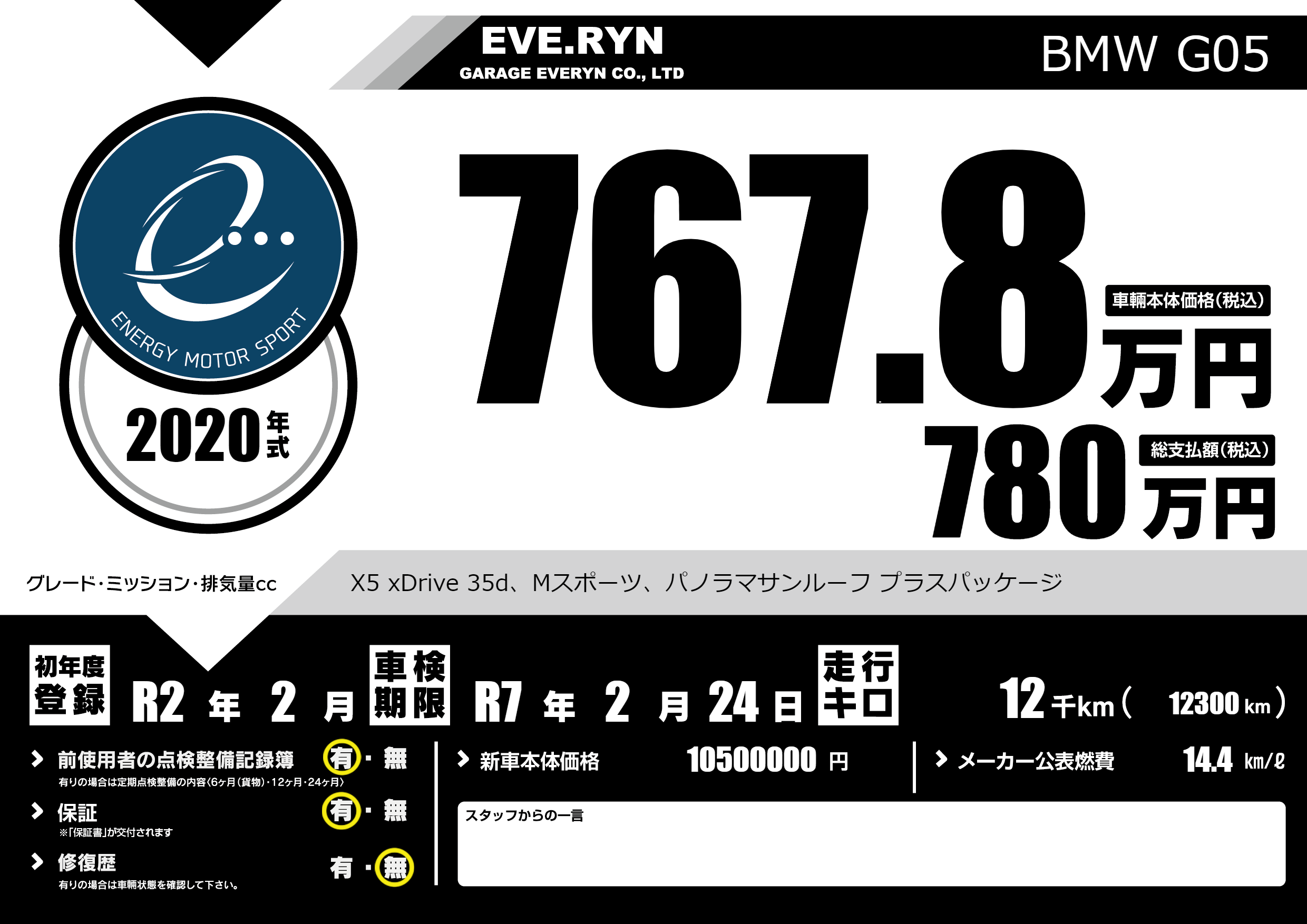 | 車名 | BMW G05 | グレード ミッション 排気量 |