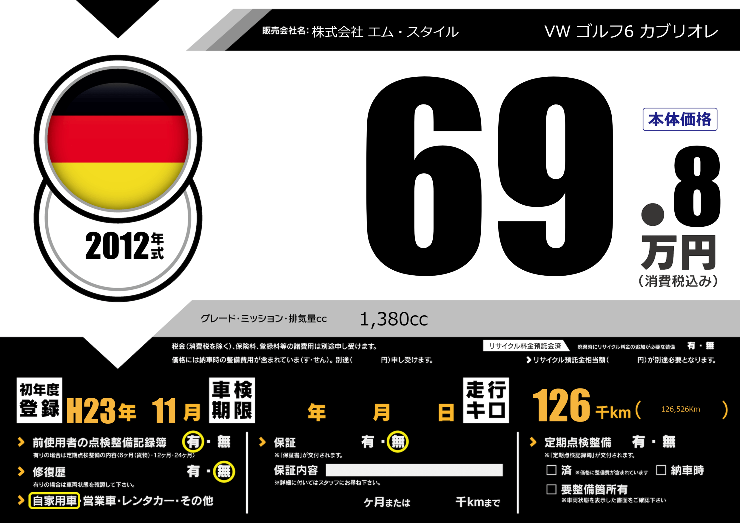 | 車名 | VW ゴルフ6 カブリオレ | グレード ミッション 排気量 |