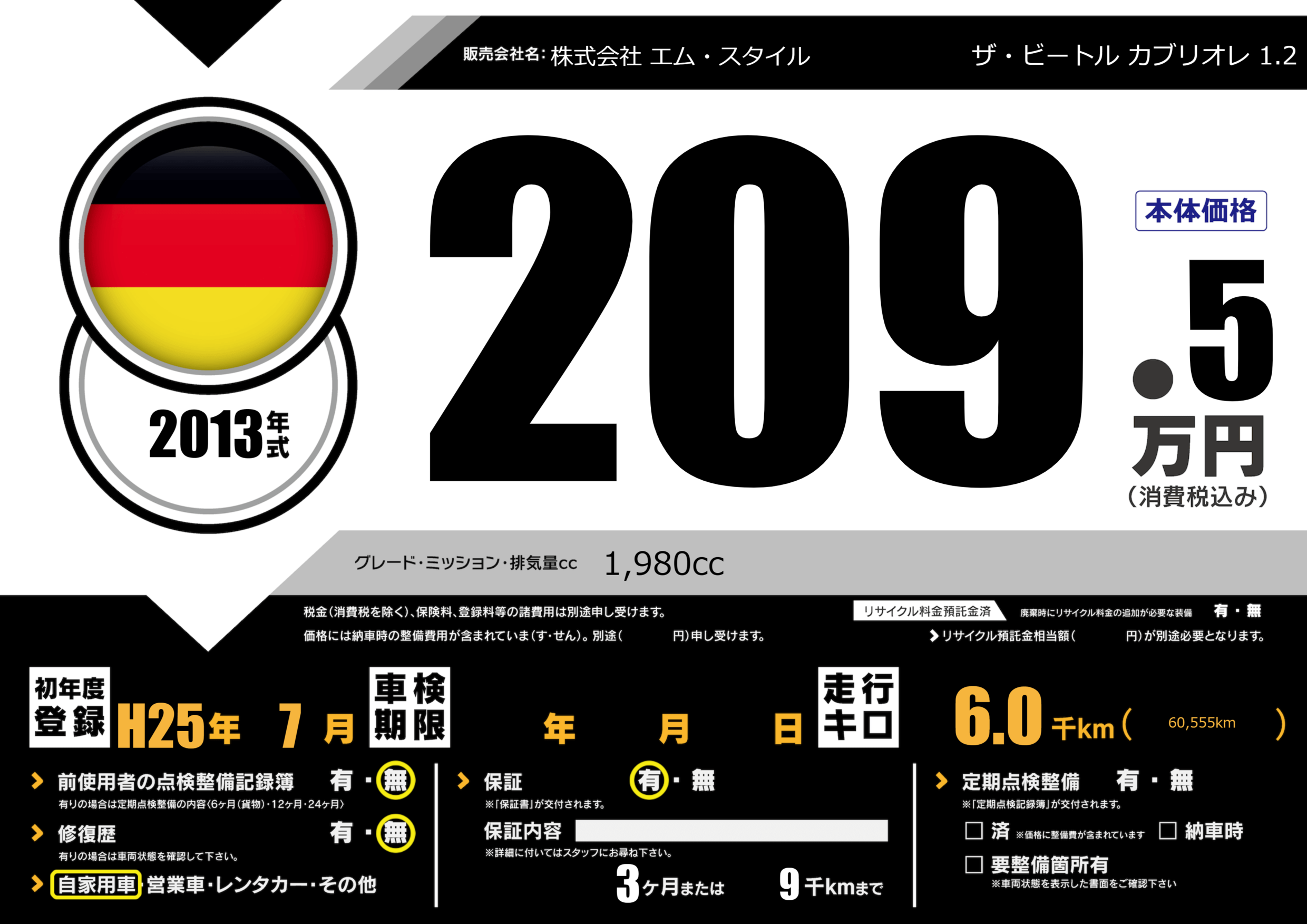 | 車名 | ザ・ビートル カブリオレ 1.2 | グレード ミッション 排気量 |
