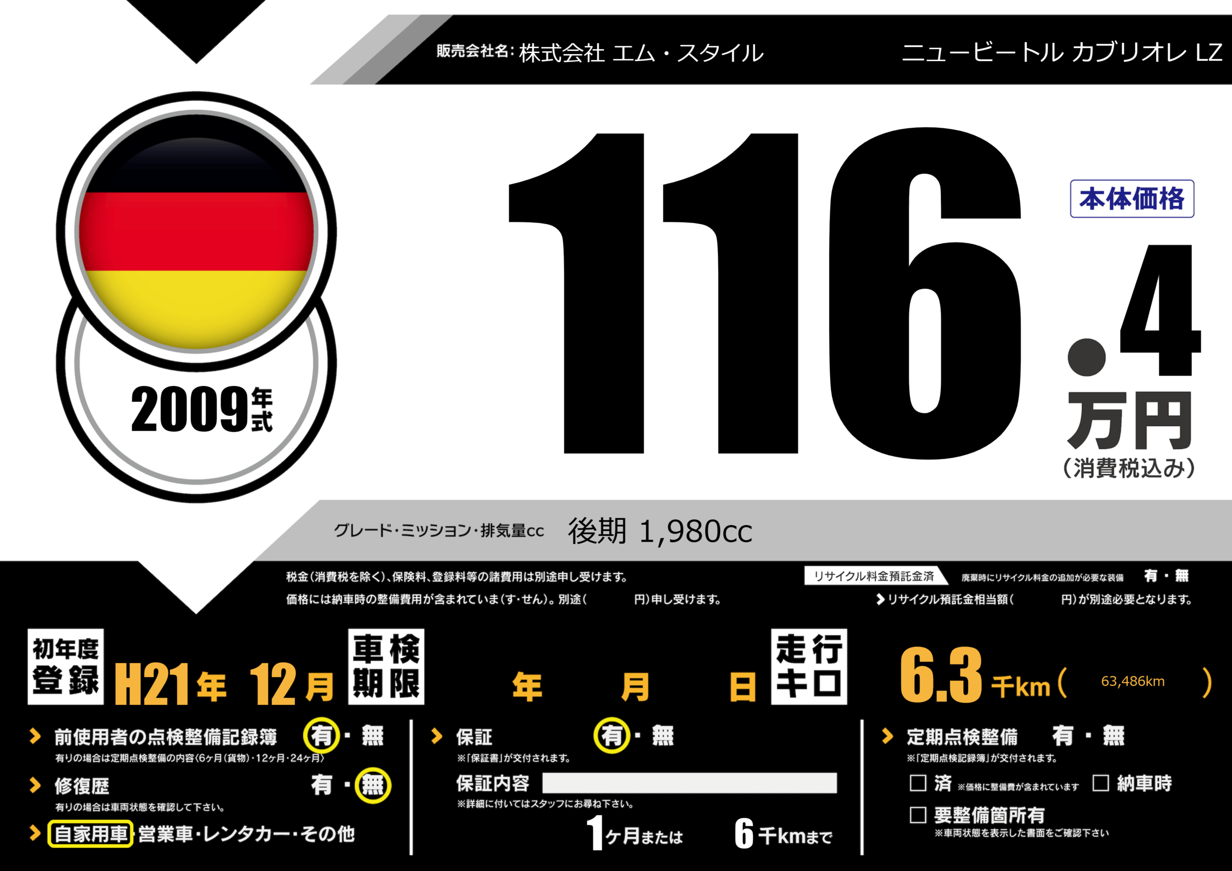 | 車名 | ニュービートル カブリオレ LZ | グレード ミッション 排気量 |