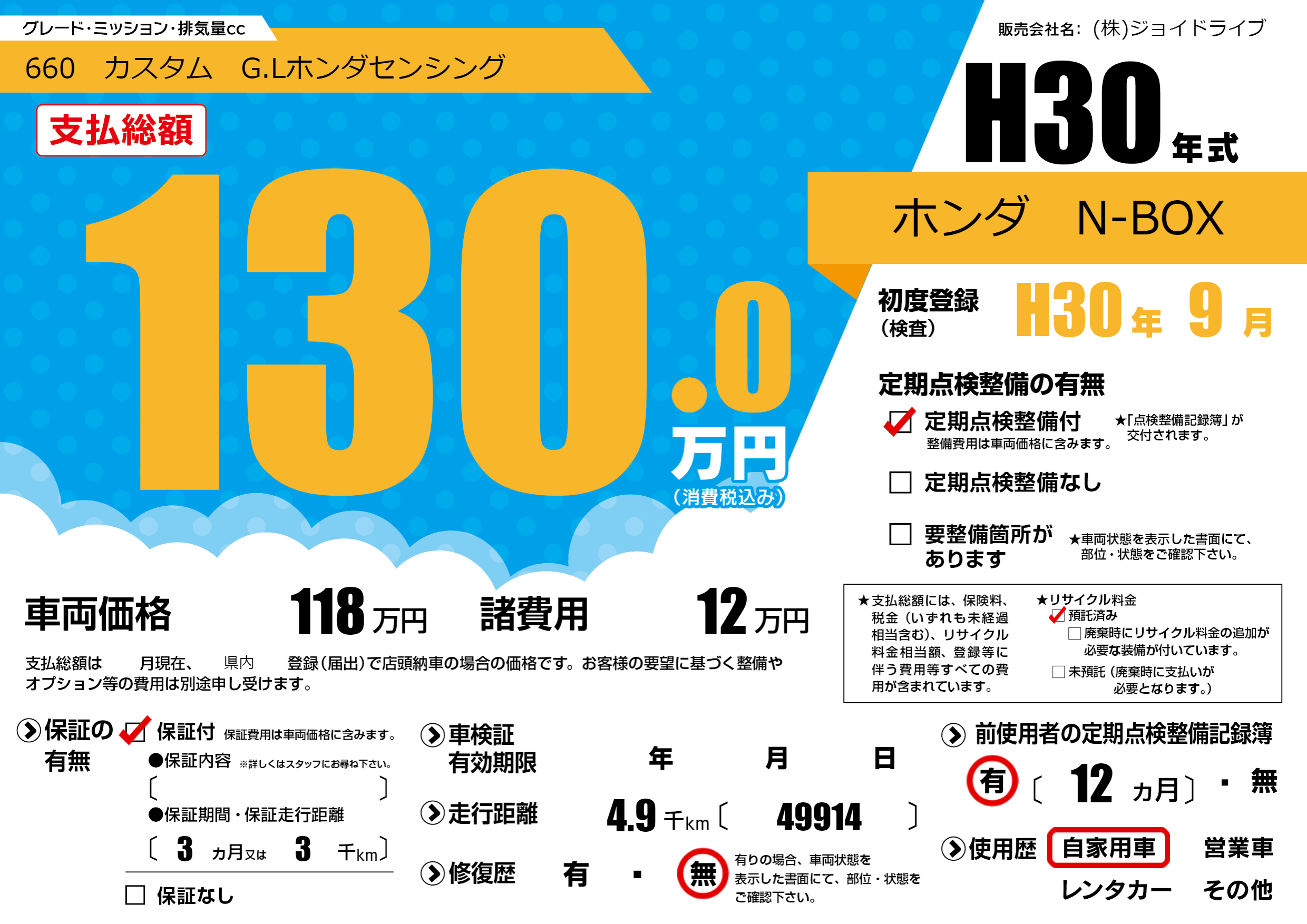 | 走行キロ | 0.4万km | 初年度登録 | H30年9月 |