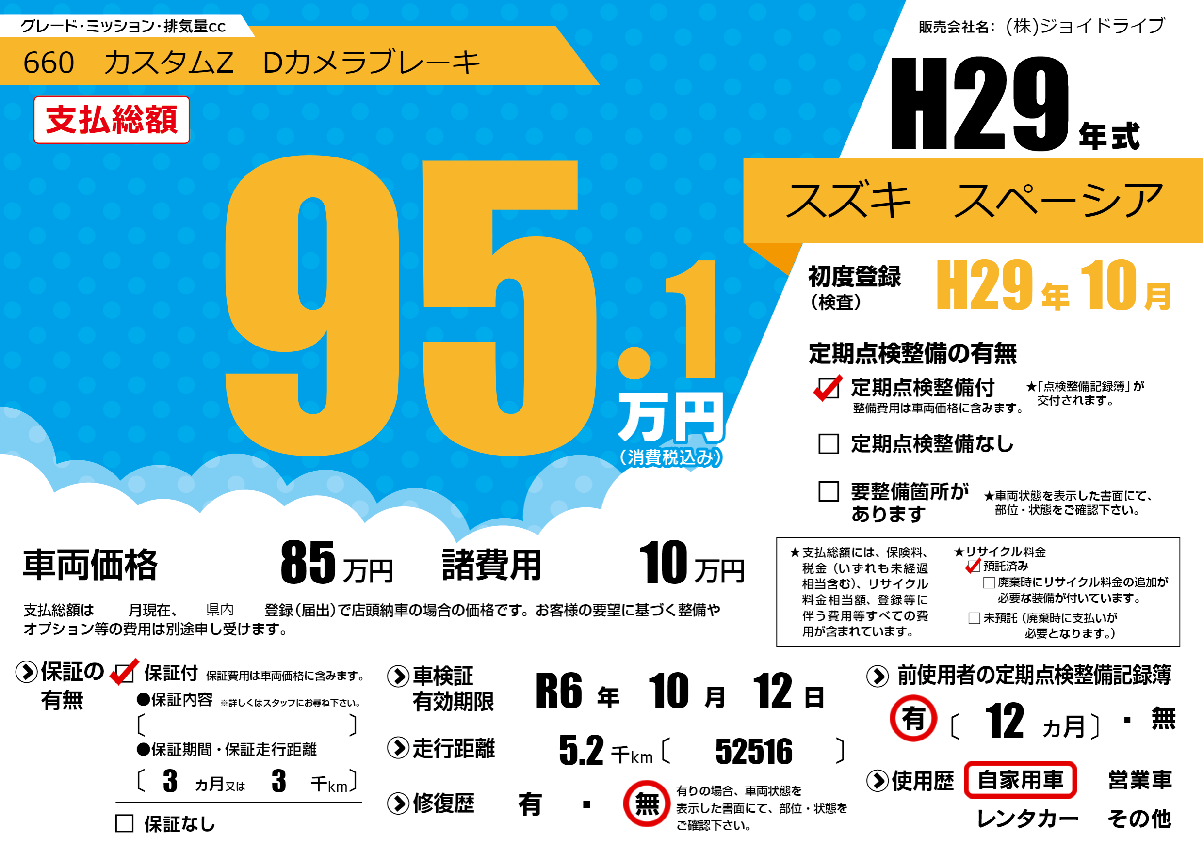| 走行キロ | 0.5万km | 初年度登録 | H29年10月 |