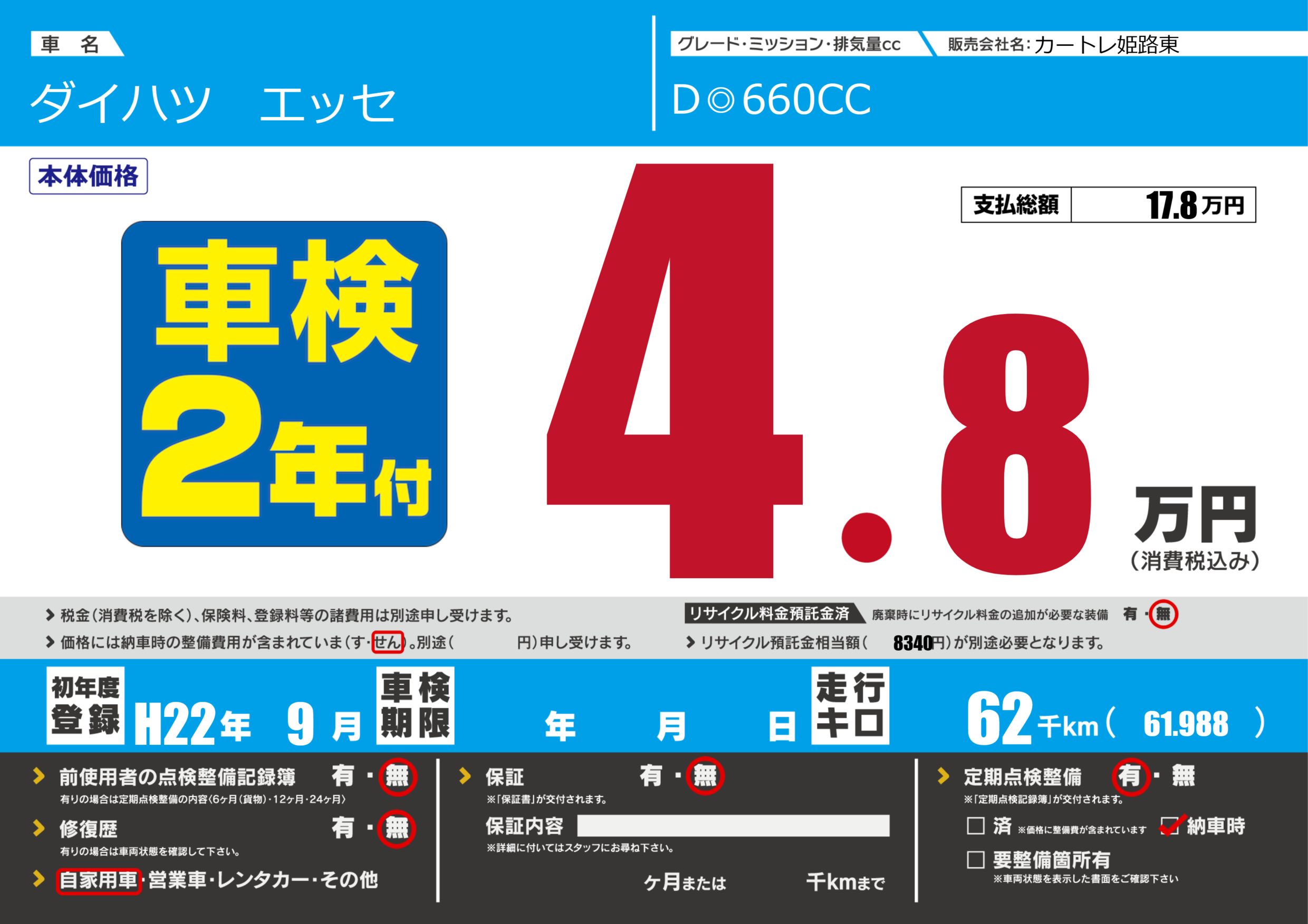 | 車名 | ダイハツ エッセ | グレード ミッション 排気量 |
