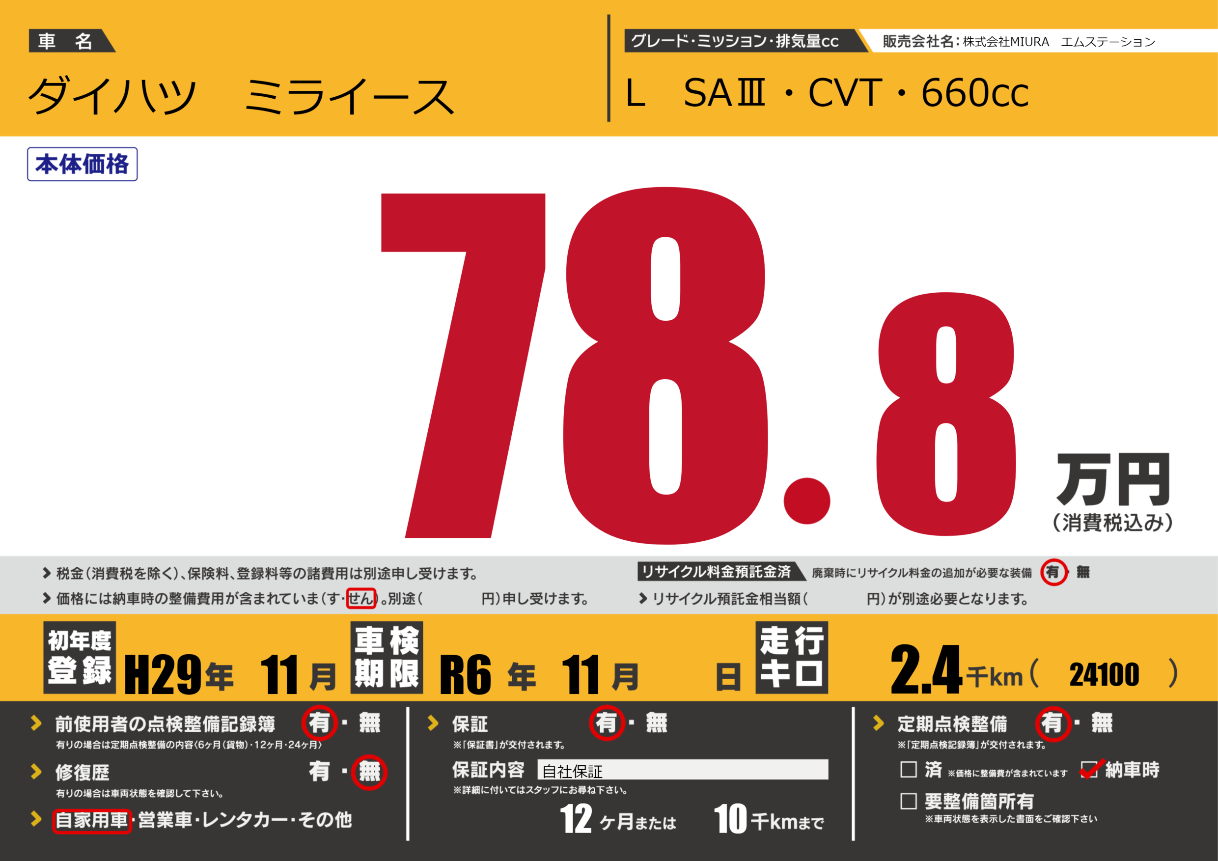 保証付き 保証内容(自社保証) 12ヶ月または(10)千kmまで |