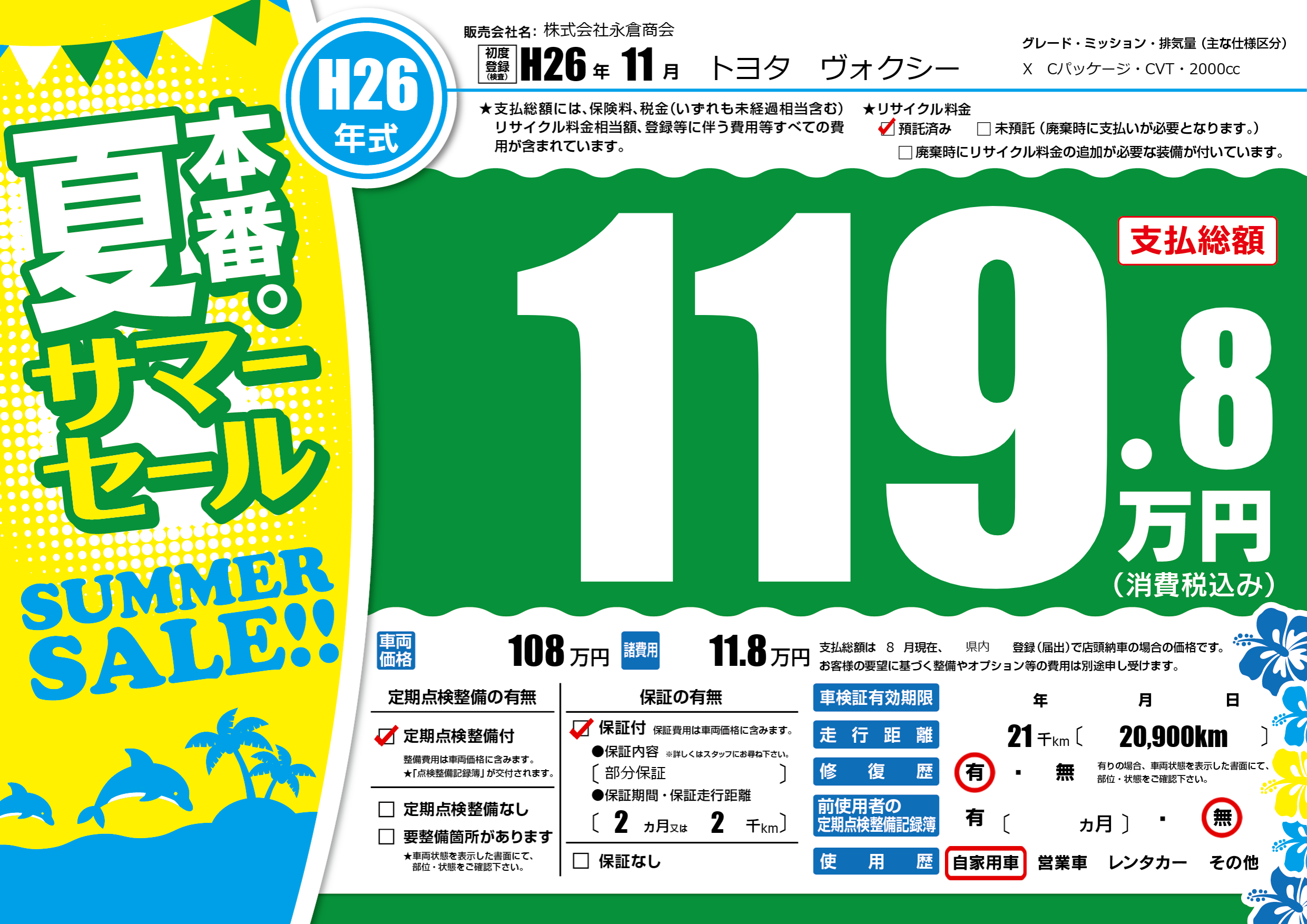 | 走行キロ | 2.1万km | 初年度登録 | H26年11月 |