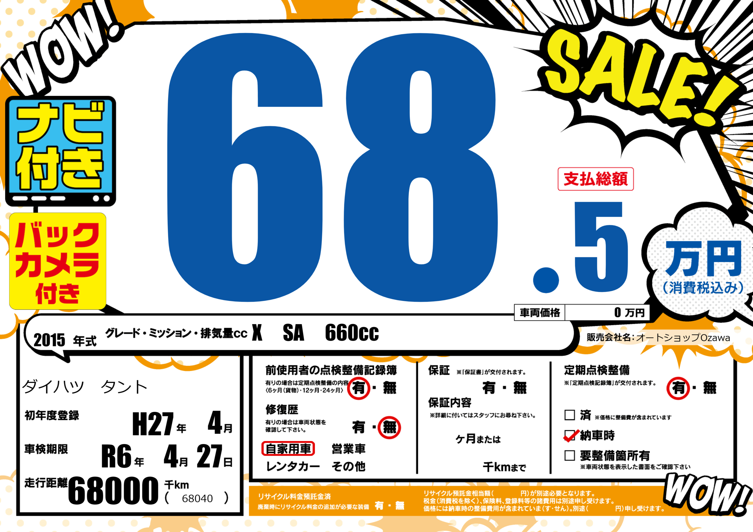 | 車名 | ダイハツ タント | グレード ミッション 排気量 |