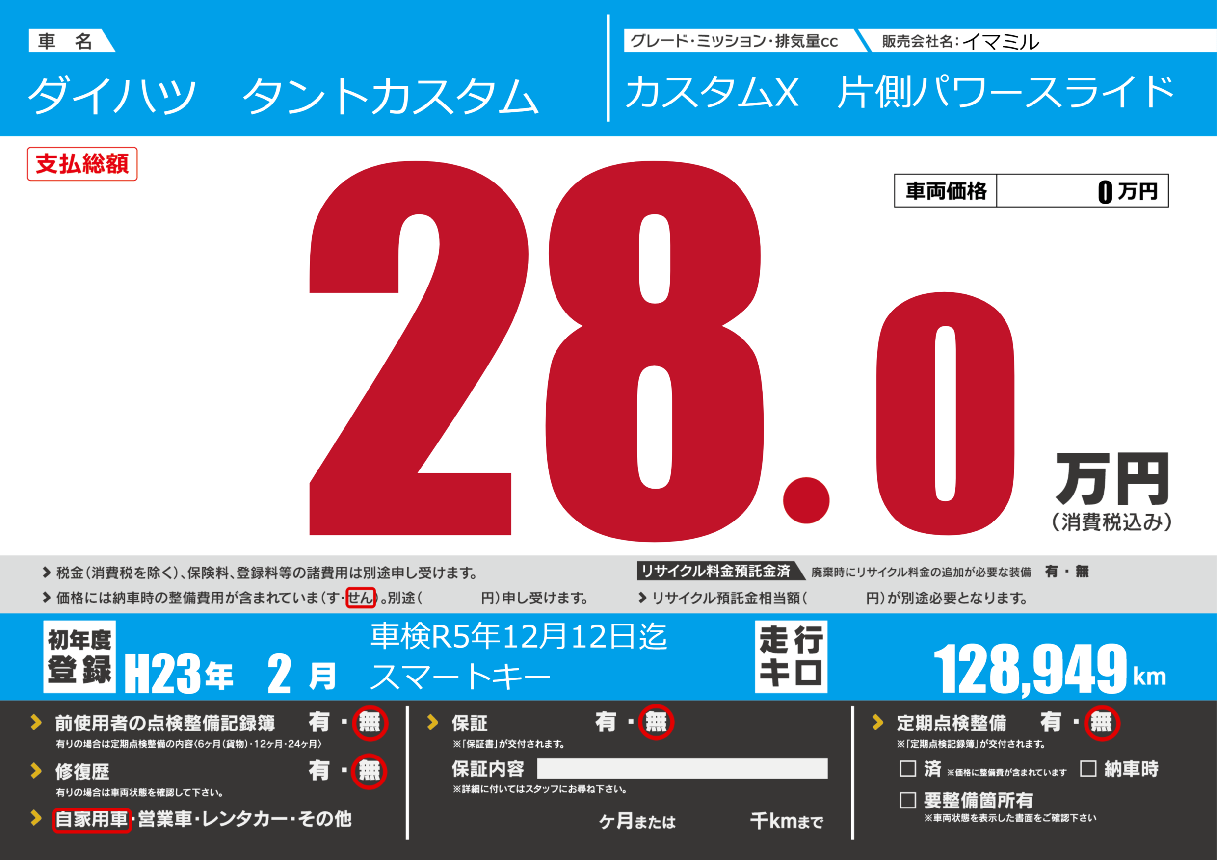 | 走行キロ | 12.8万km | 初年度登録 | H23年2月 |