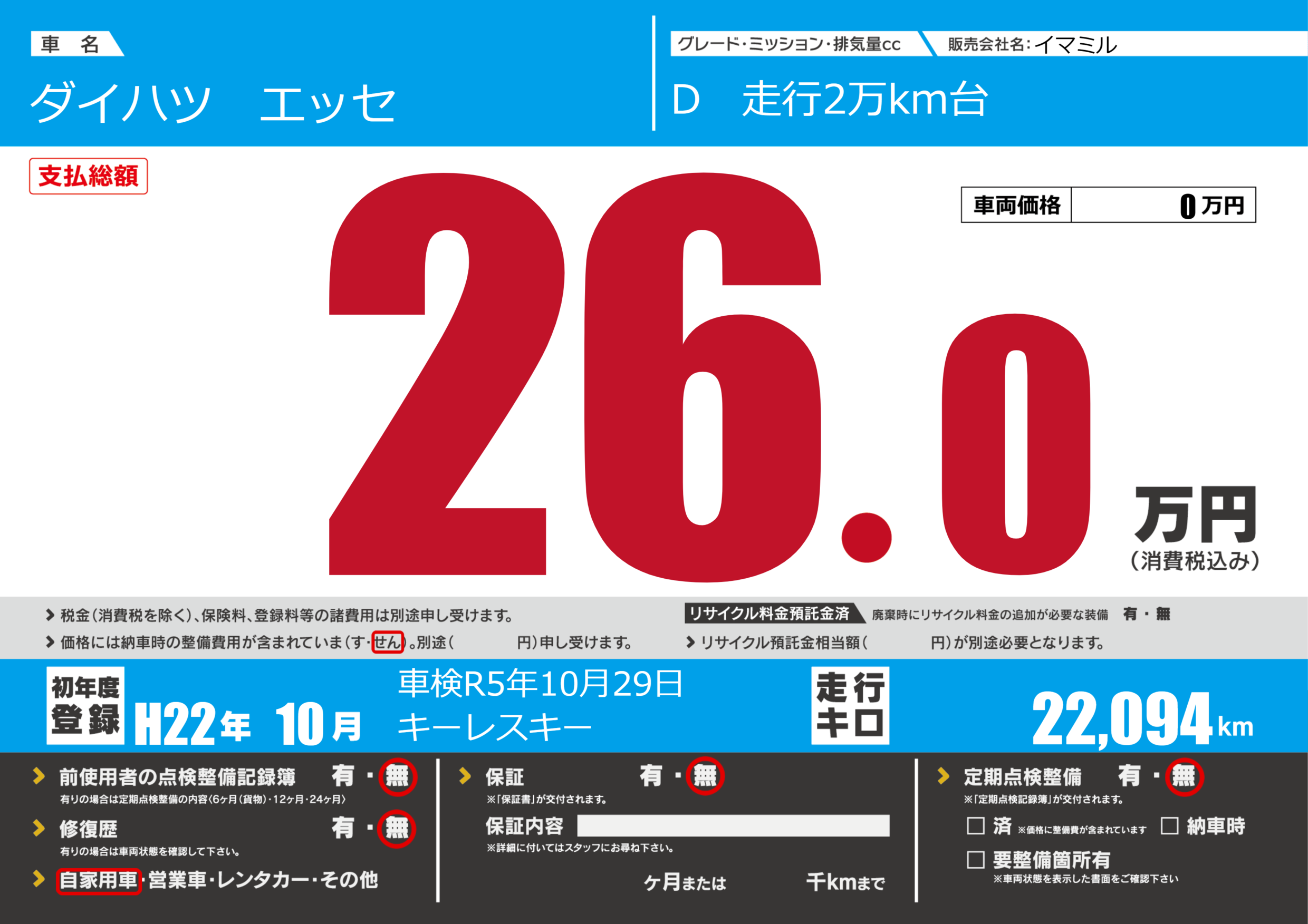 | 走行キロ | 2.2万km | 初年度登録 | H22年10月 |