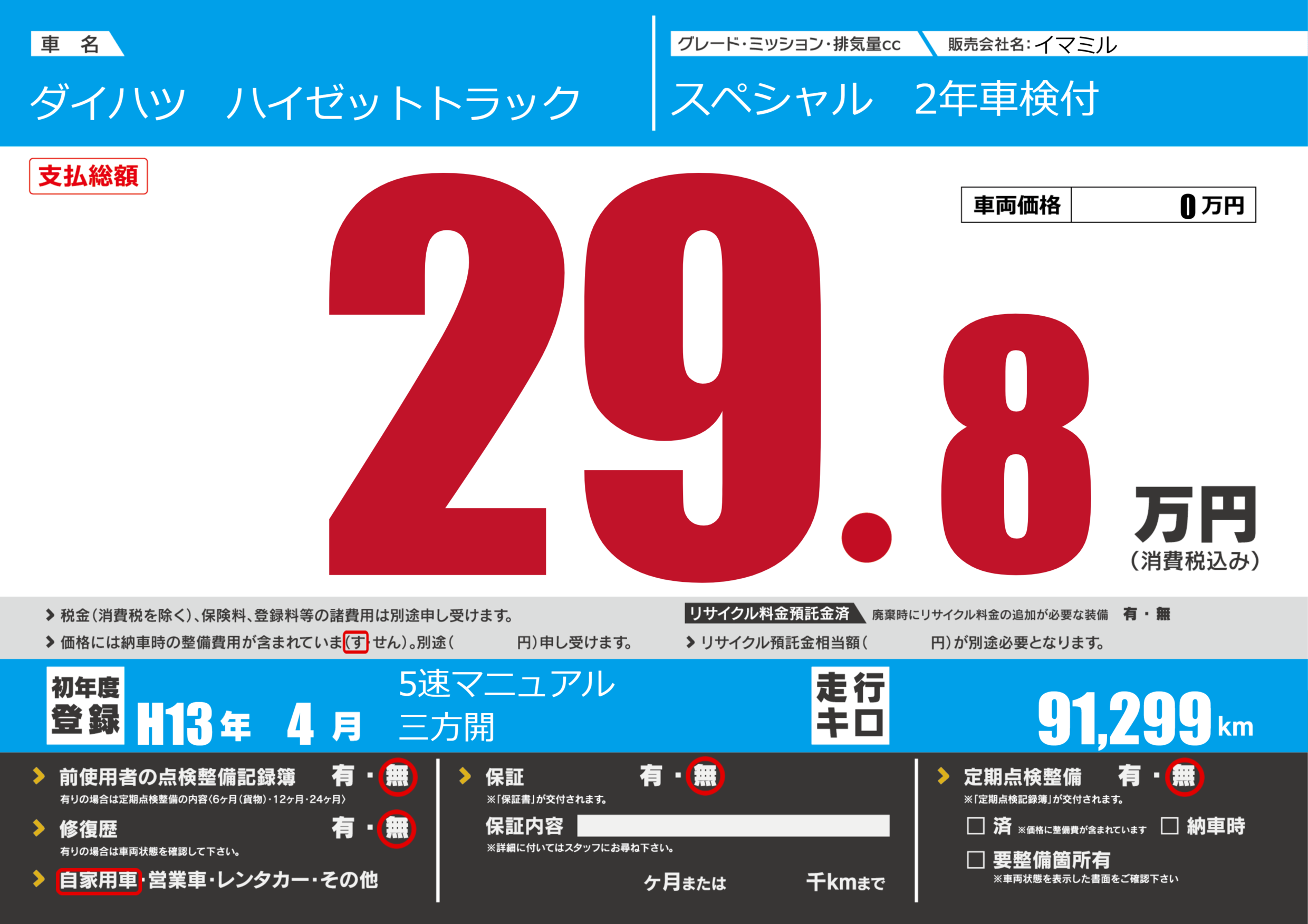 | 走行キロ | 9.1万km | 初年度登録 | H13年4月 |