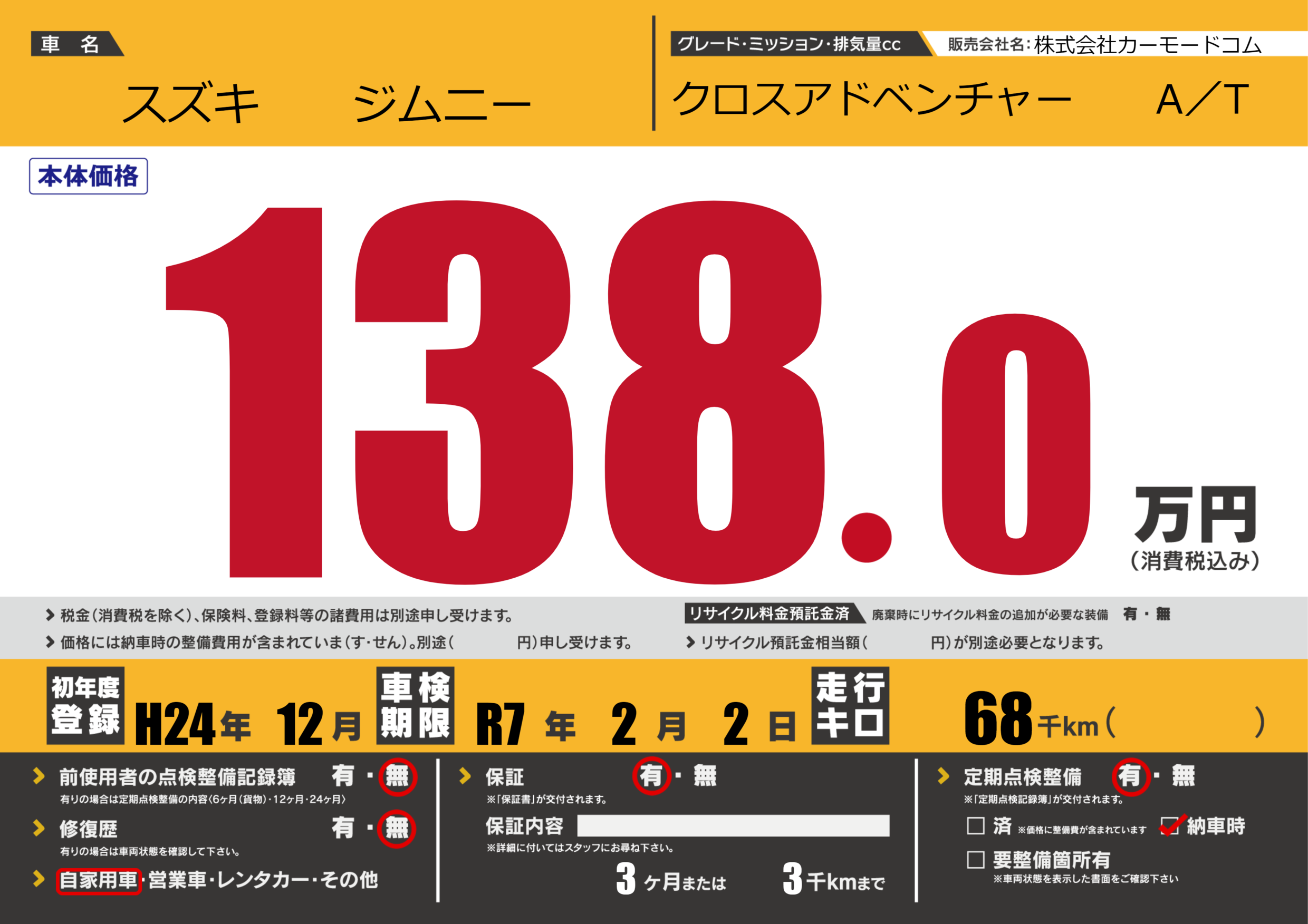 | 車名 | スズキ ジムニー | グレード ミッション 排気量 |