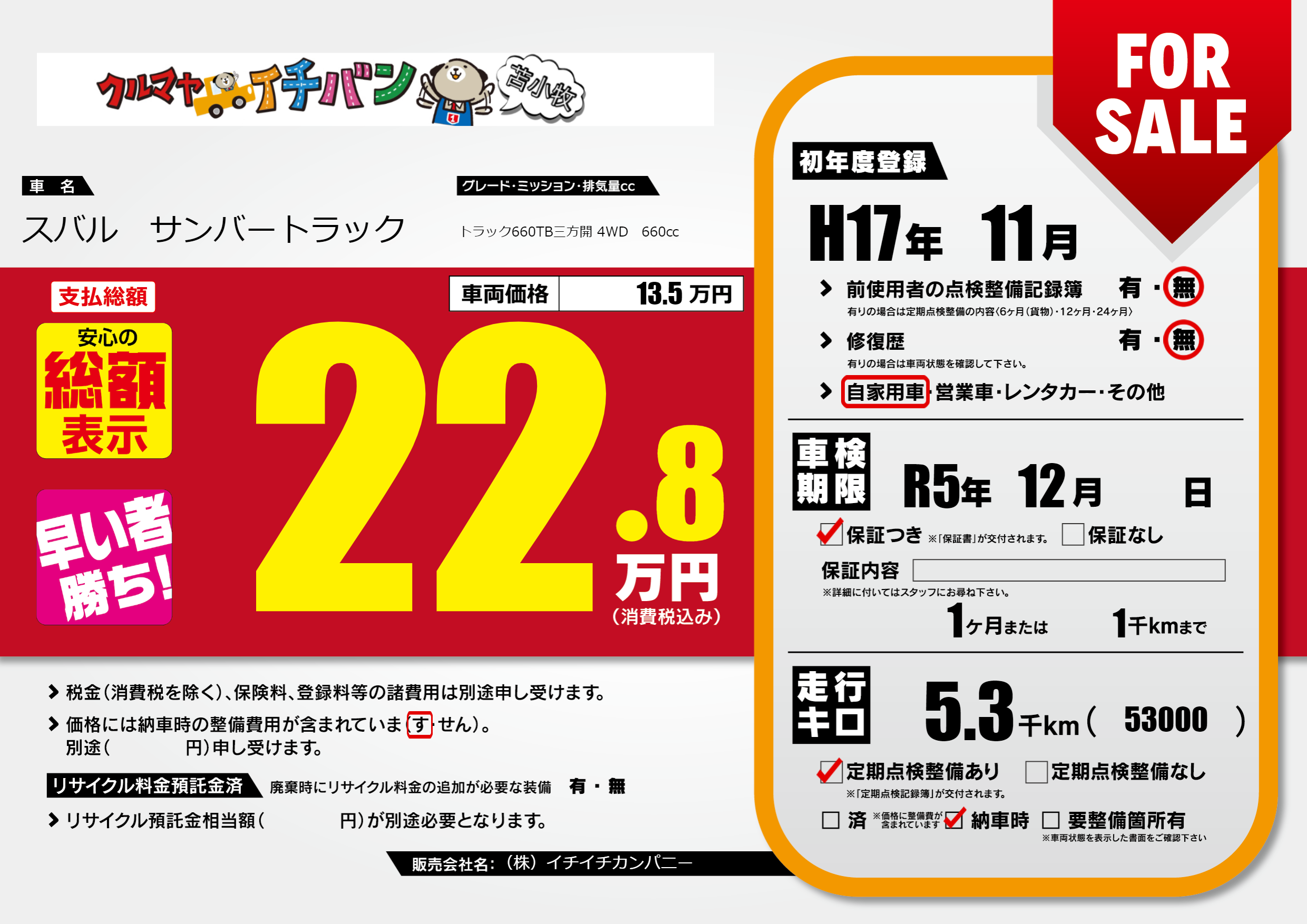 | 車名 | スバル サンバートラック | グレード ミッション 排気量 |