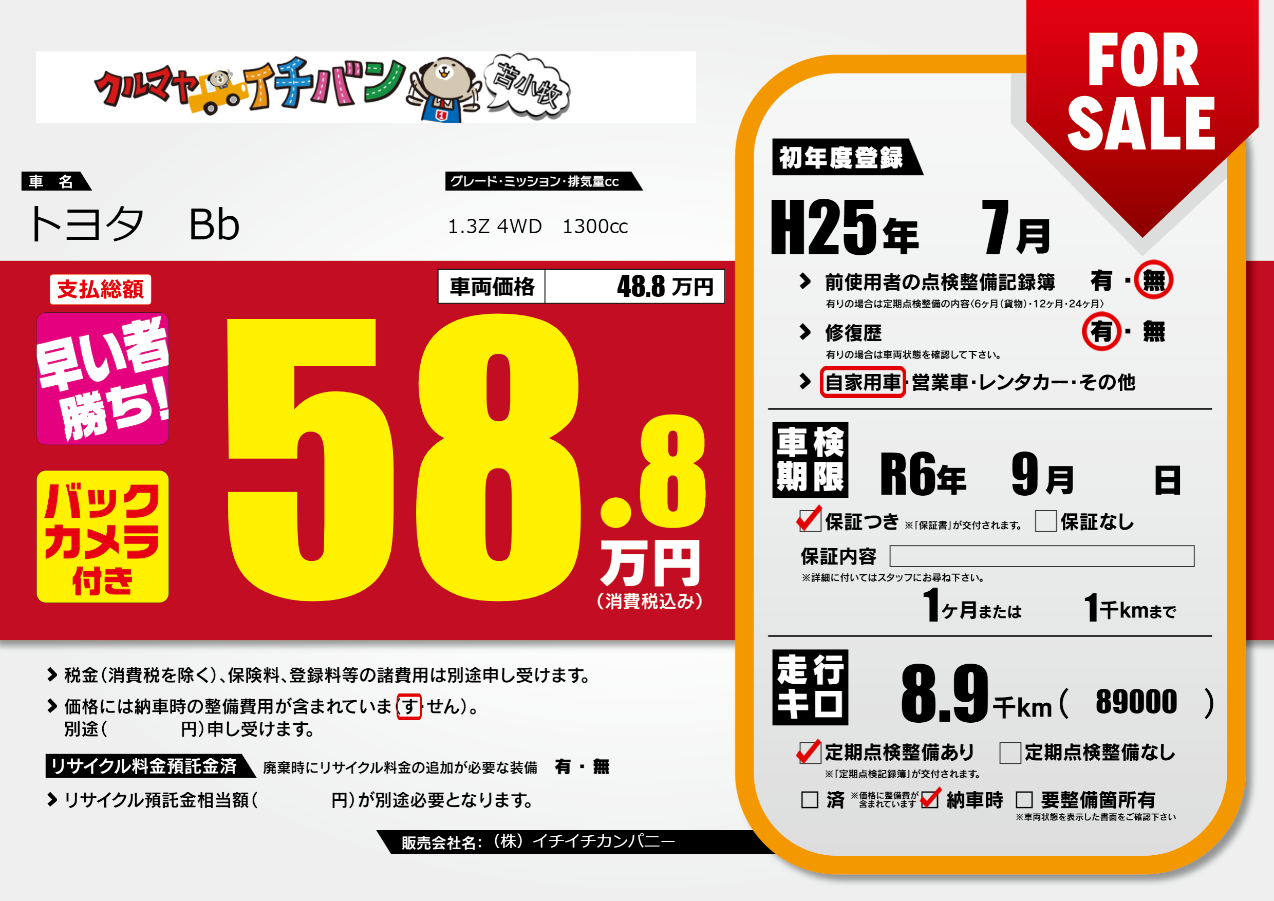| 車名 | トヨタ Bb | グレード ミッション 排気量 |