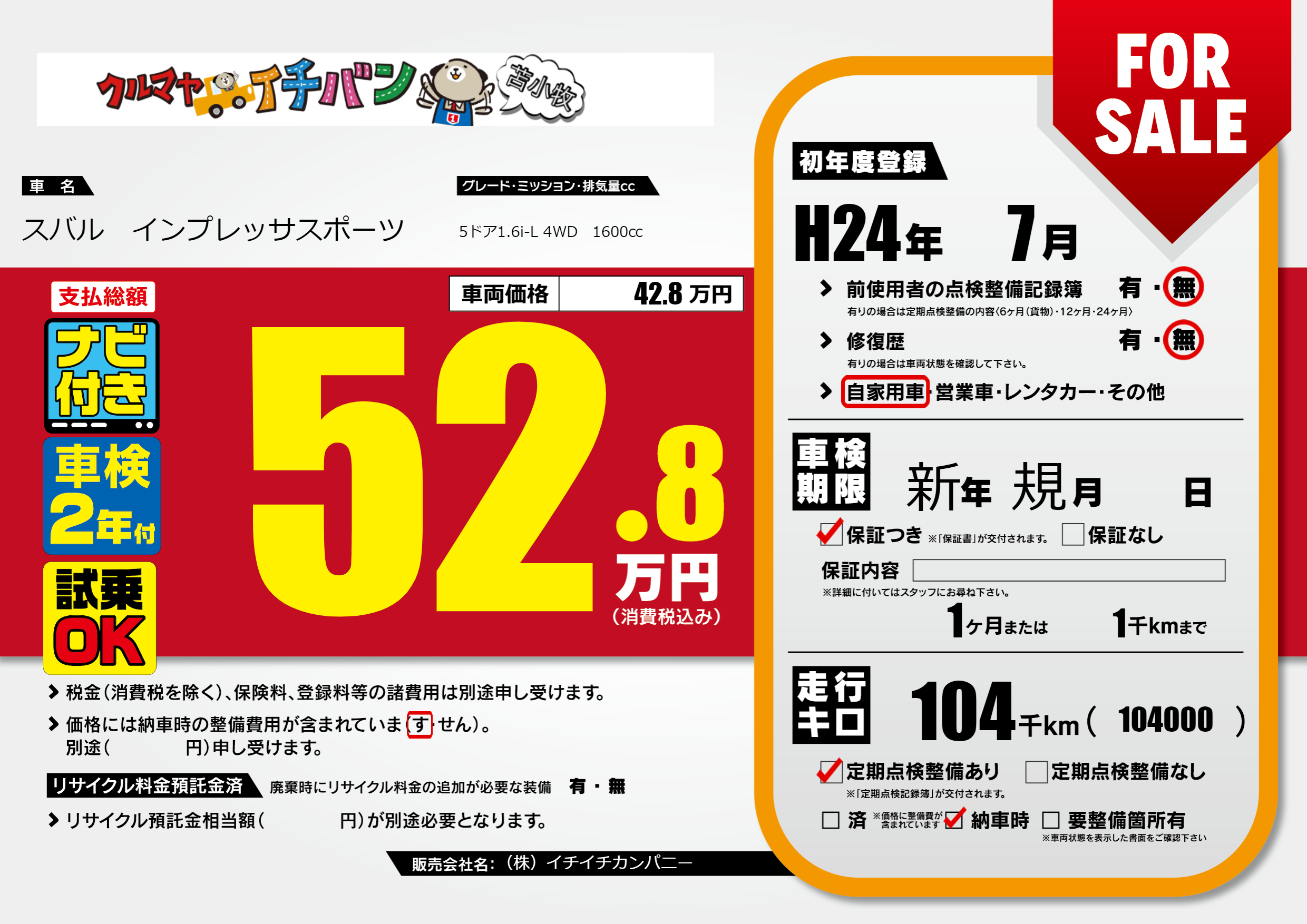 | 走行キロ | 10.4万km | 初年度登録 | H24年7月 |