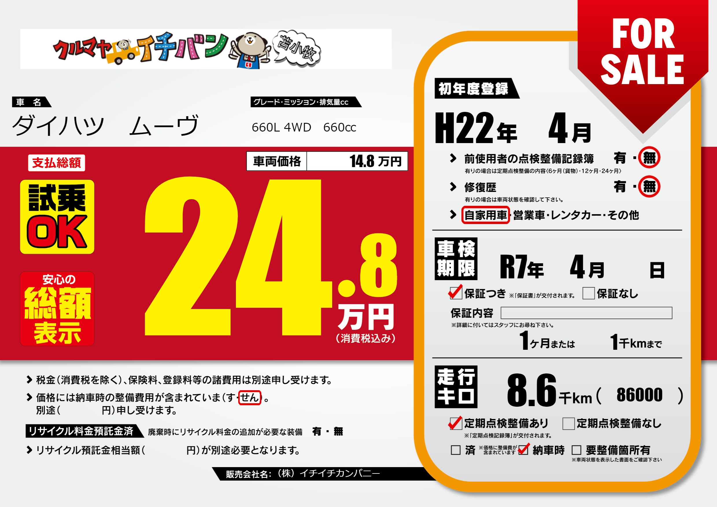 | 走行キロ | 0.8万km | 初年度登録 | H22年4月 |