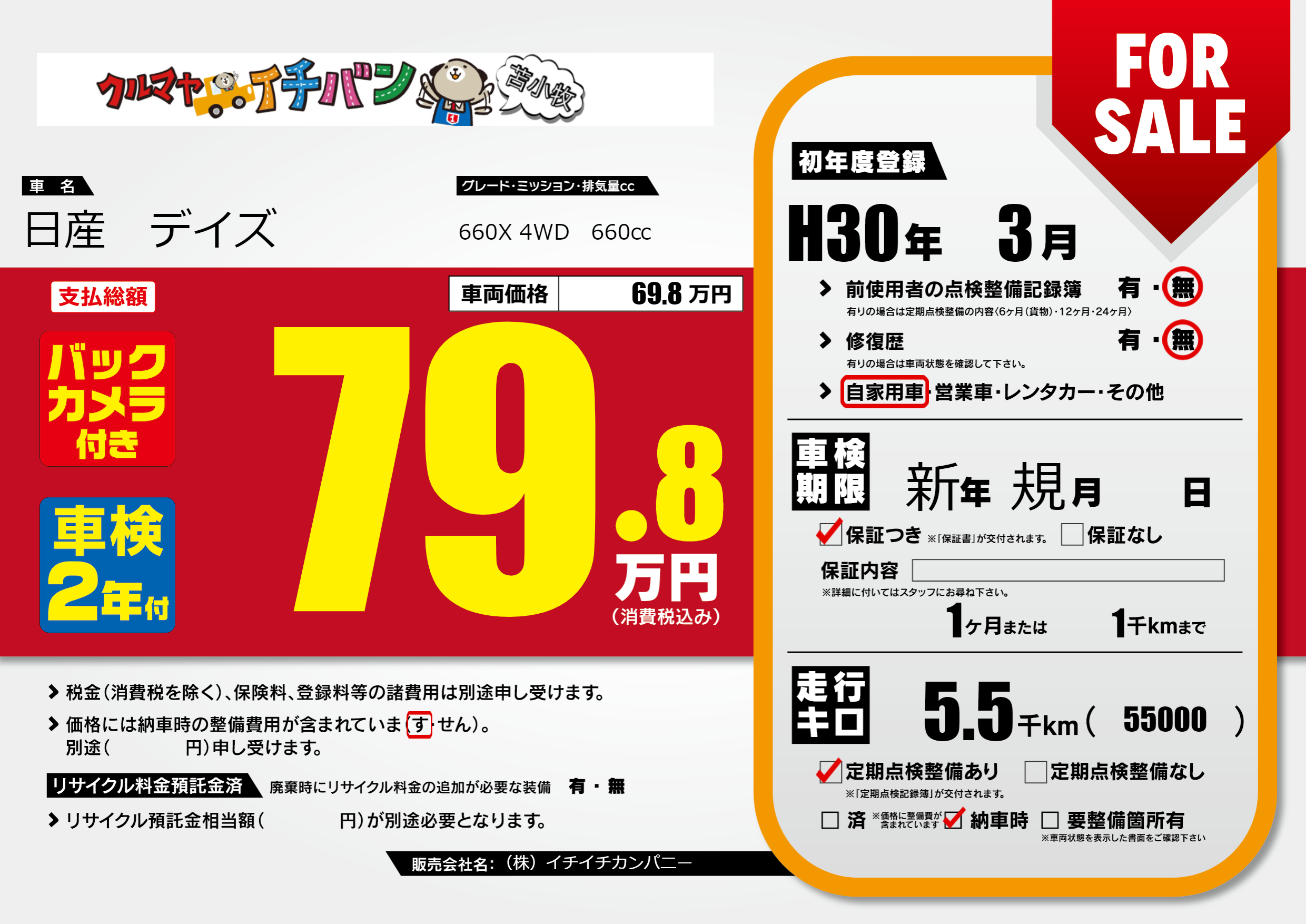 | 車名 | 日産 デイズ | グレード ミッション 排気量 |