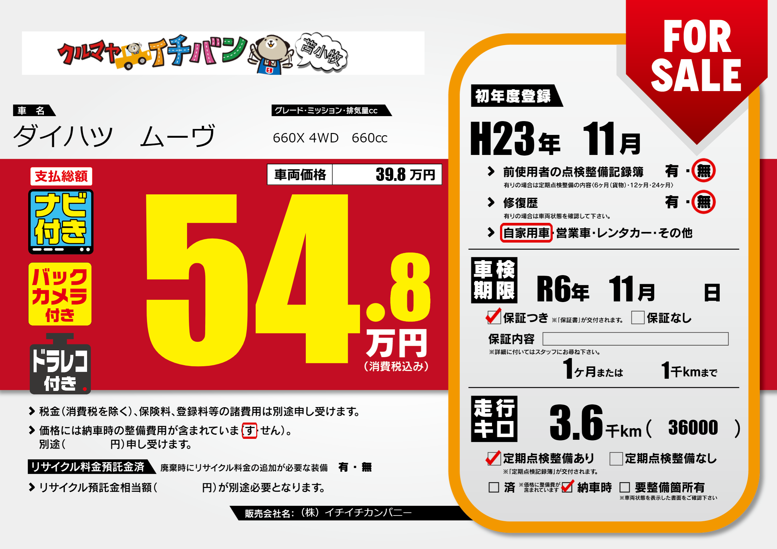 | 走行キロ | 0.3万km | 初年度登録 | H23年11月 |