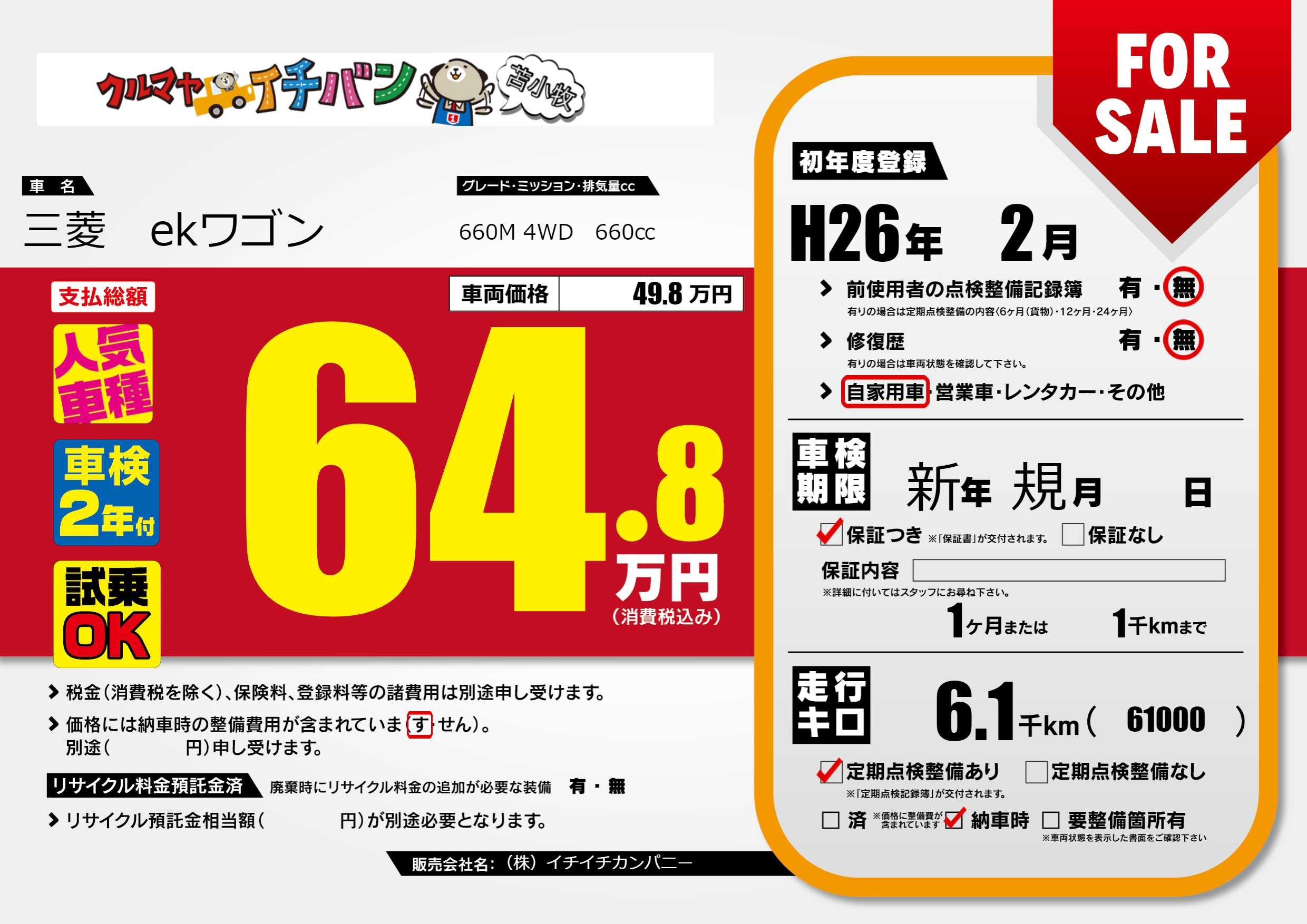 保証付き 保証内容(---) 1ヶ月または(1)千kmまで |