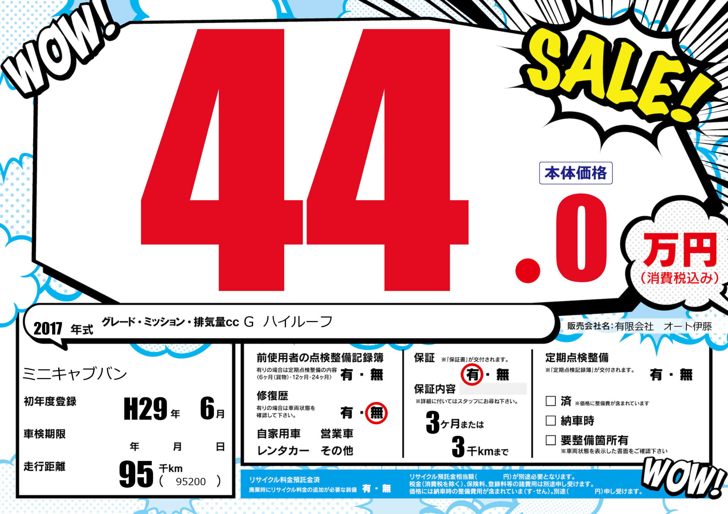 | 走行キロ | 9.5万km | 初年度登録 | H29年6月 |