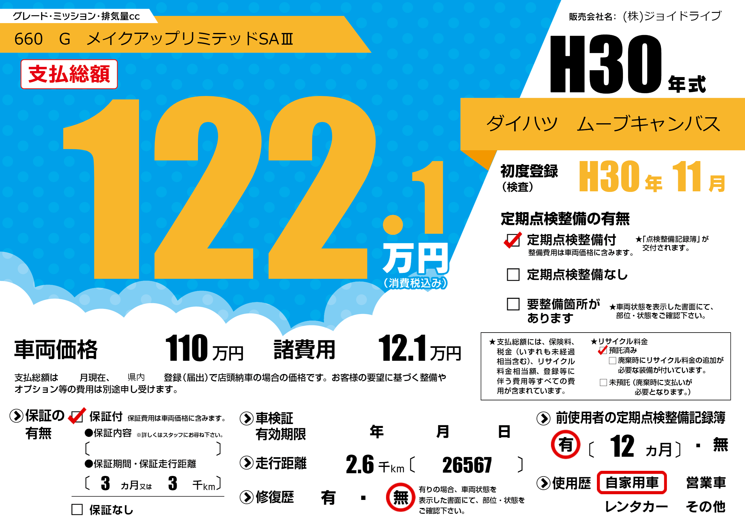 | 車名 | ダイハツ ムーブキャンバス | グレード ミッション 排気量 |