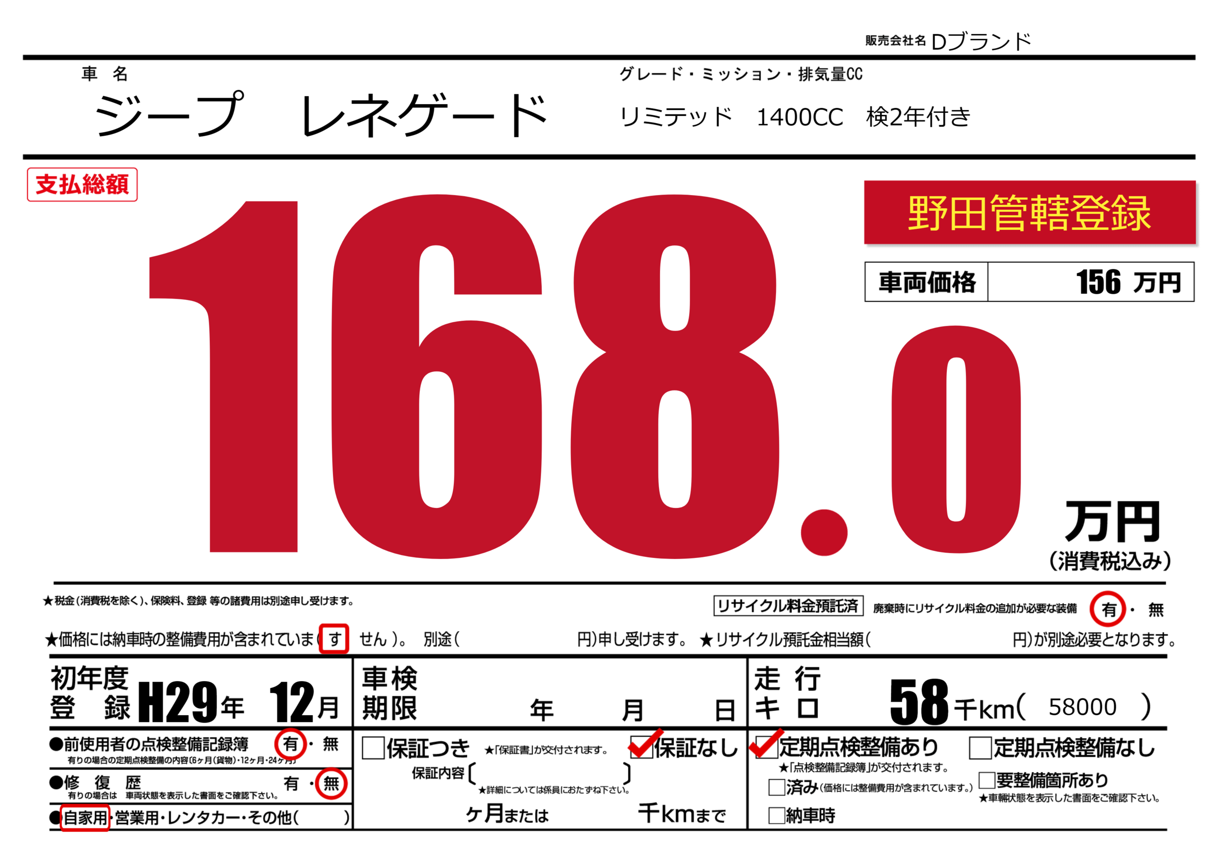 | 車名 | ジープ レネゲード | グレード ミッション 排気量 |