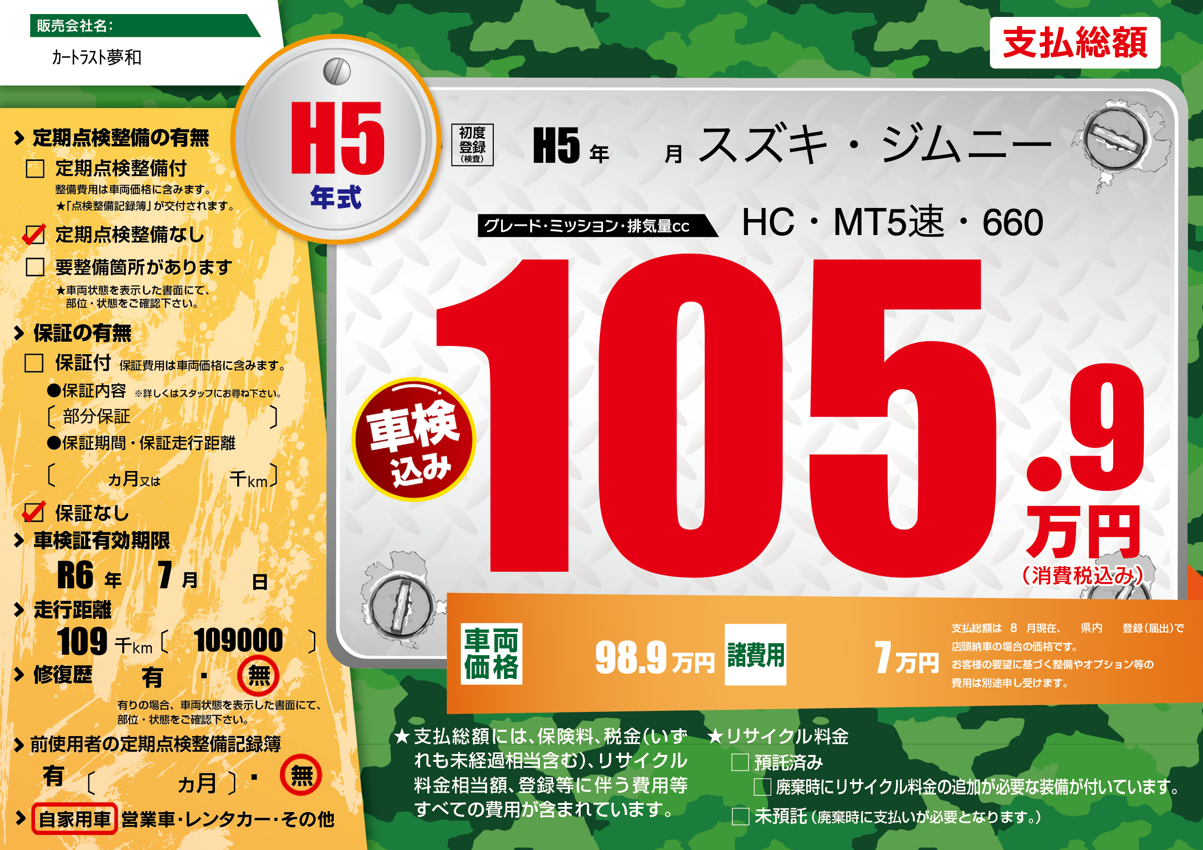 | 走行キロ | 10.9万km | 初年度登録 | H5年---月 |