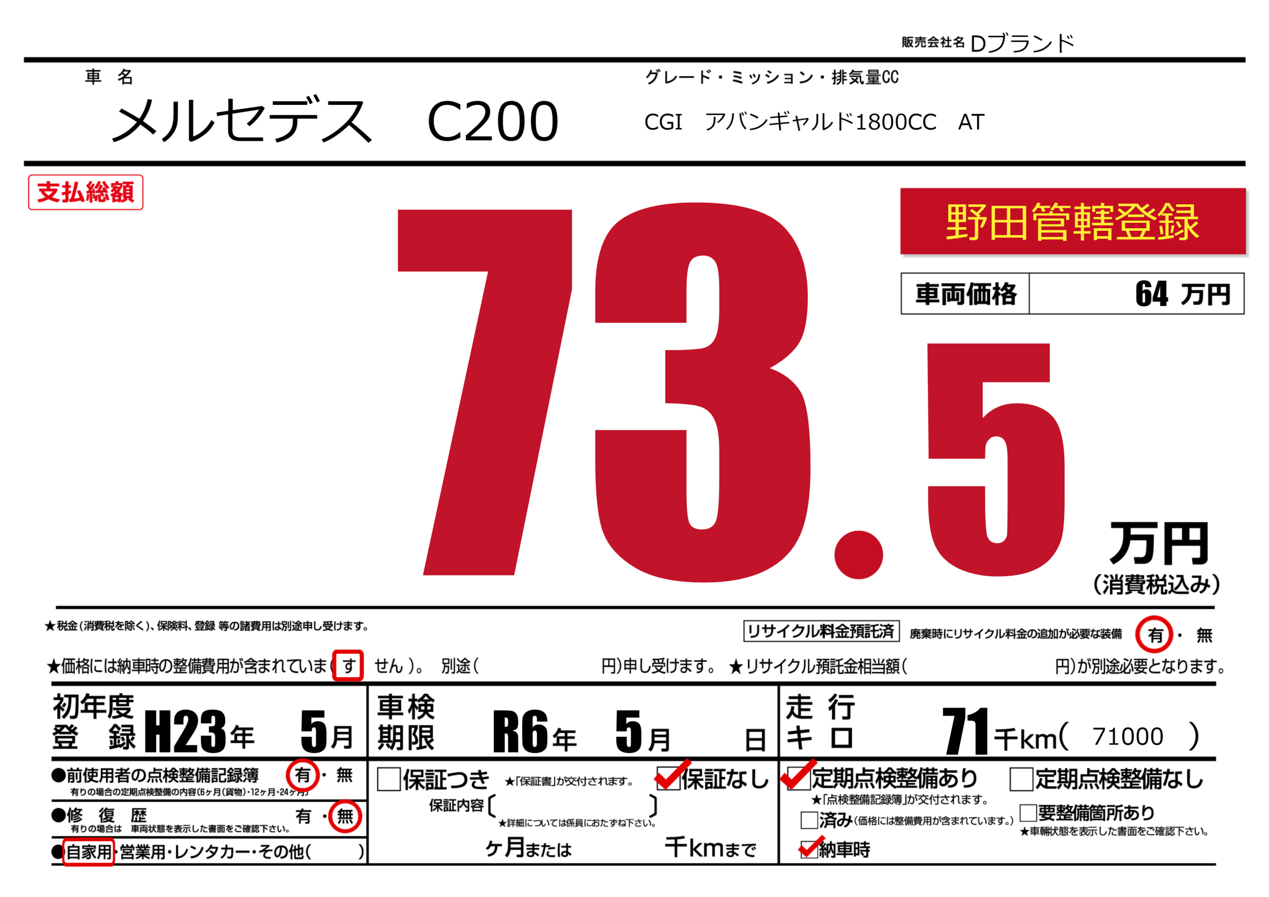 | 定期点検整備 | 定期点検整備あり 納車時あり | ||