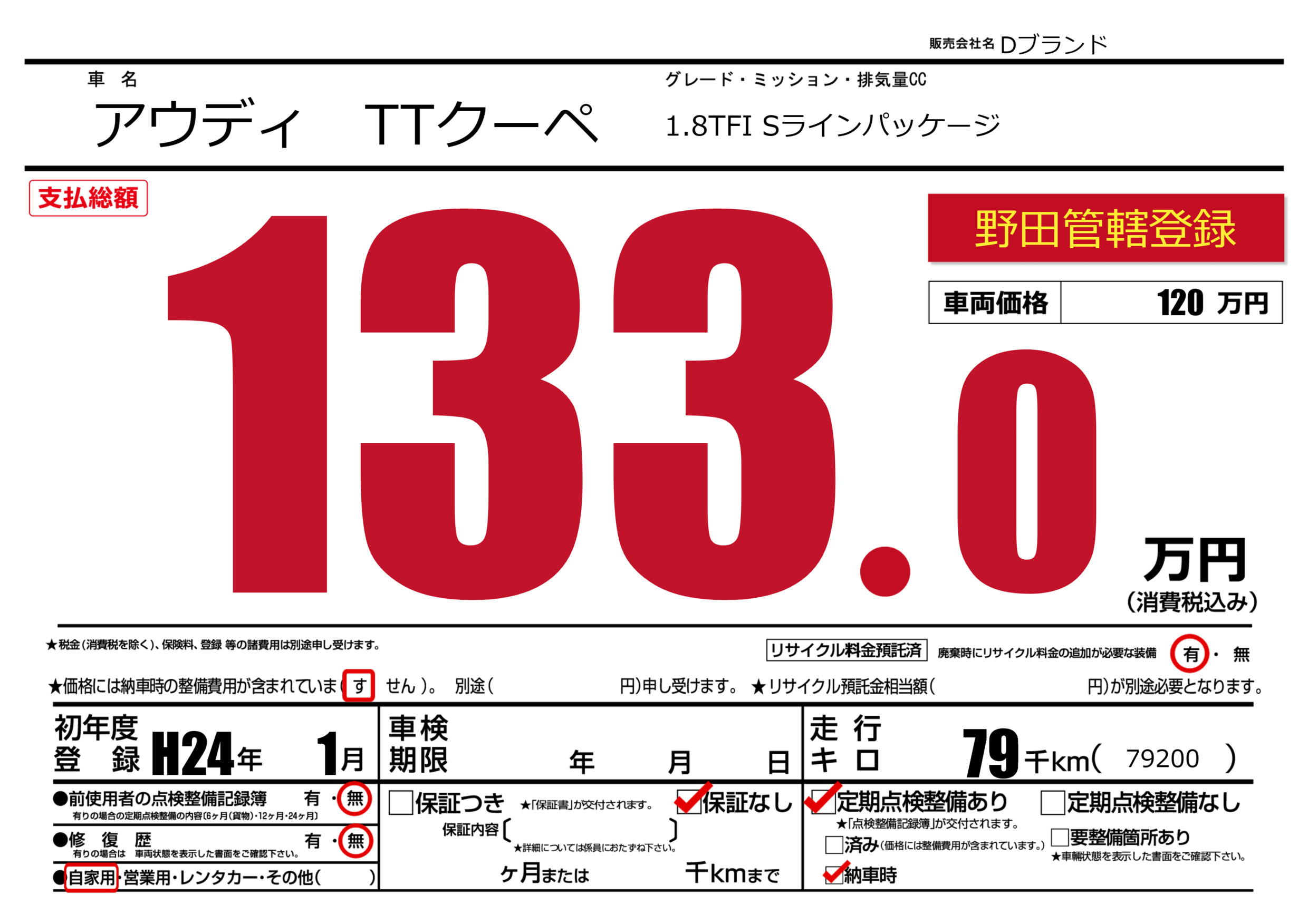 | 定期点検整備 | 定期点検整備あり 納車時あり | ||