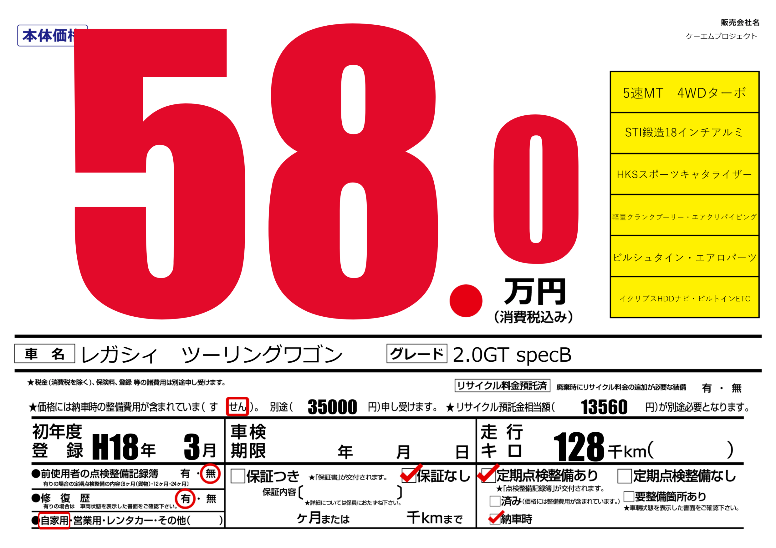 | 車名 | レガシィ ツーリングワゴン | グレード ミッション 排気量 |
