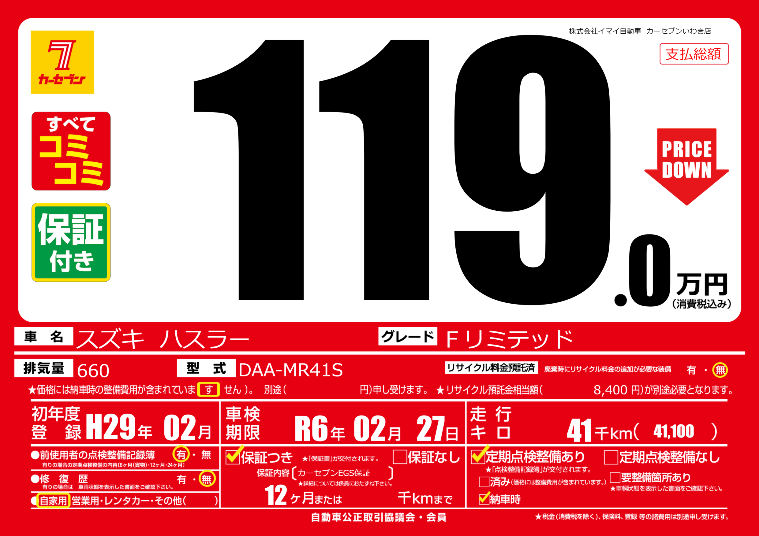 | 走行キロ | 4.1万km | 初年度登録 | H29年02月 |