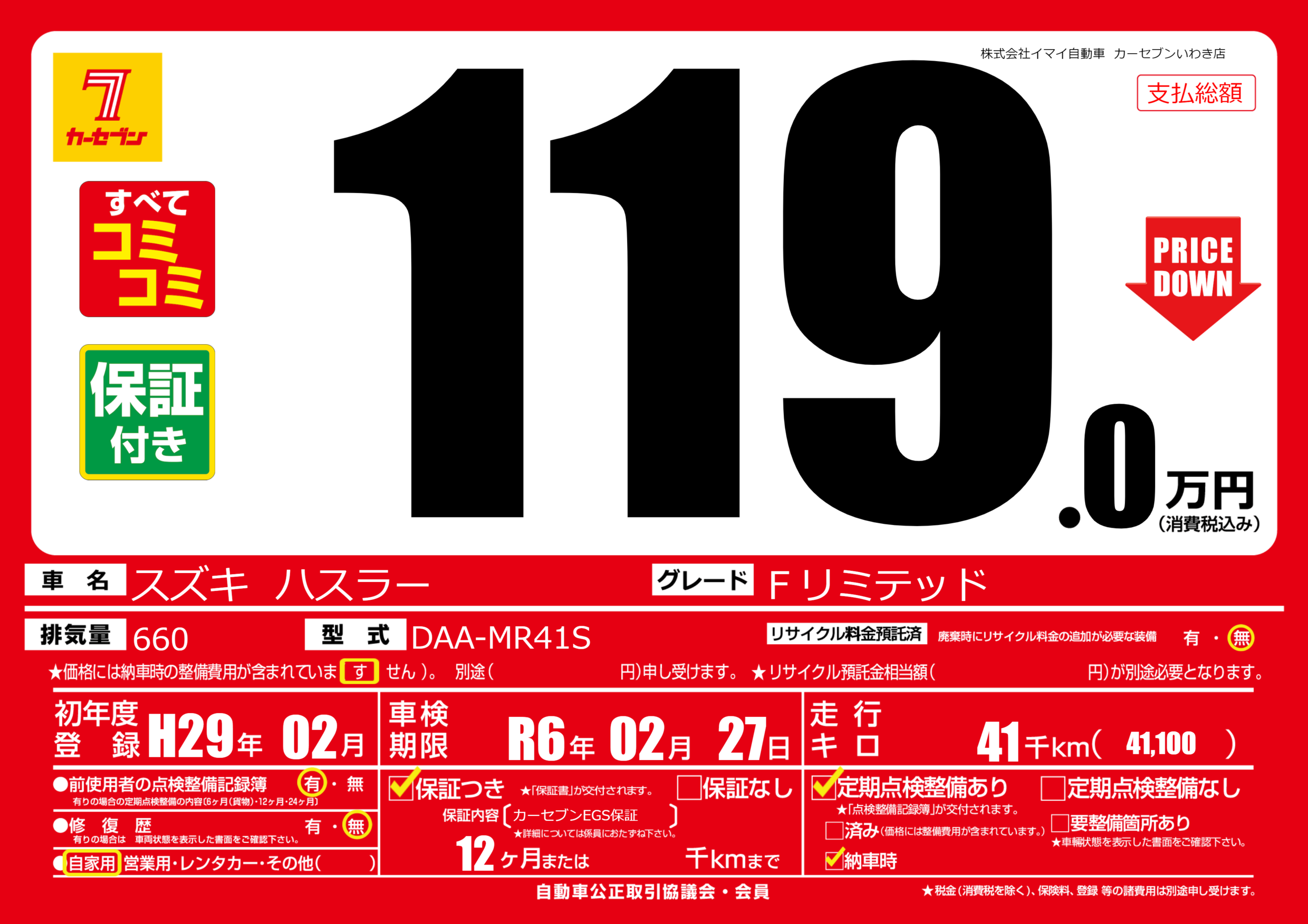 | 走行キロ | 4.1万km | 初年度登録 | H29年02月 |