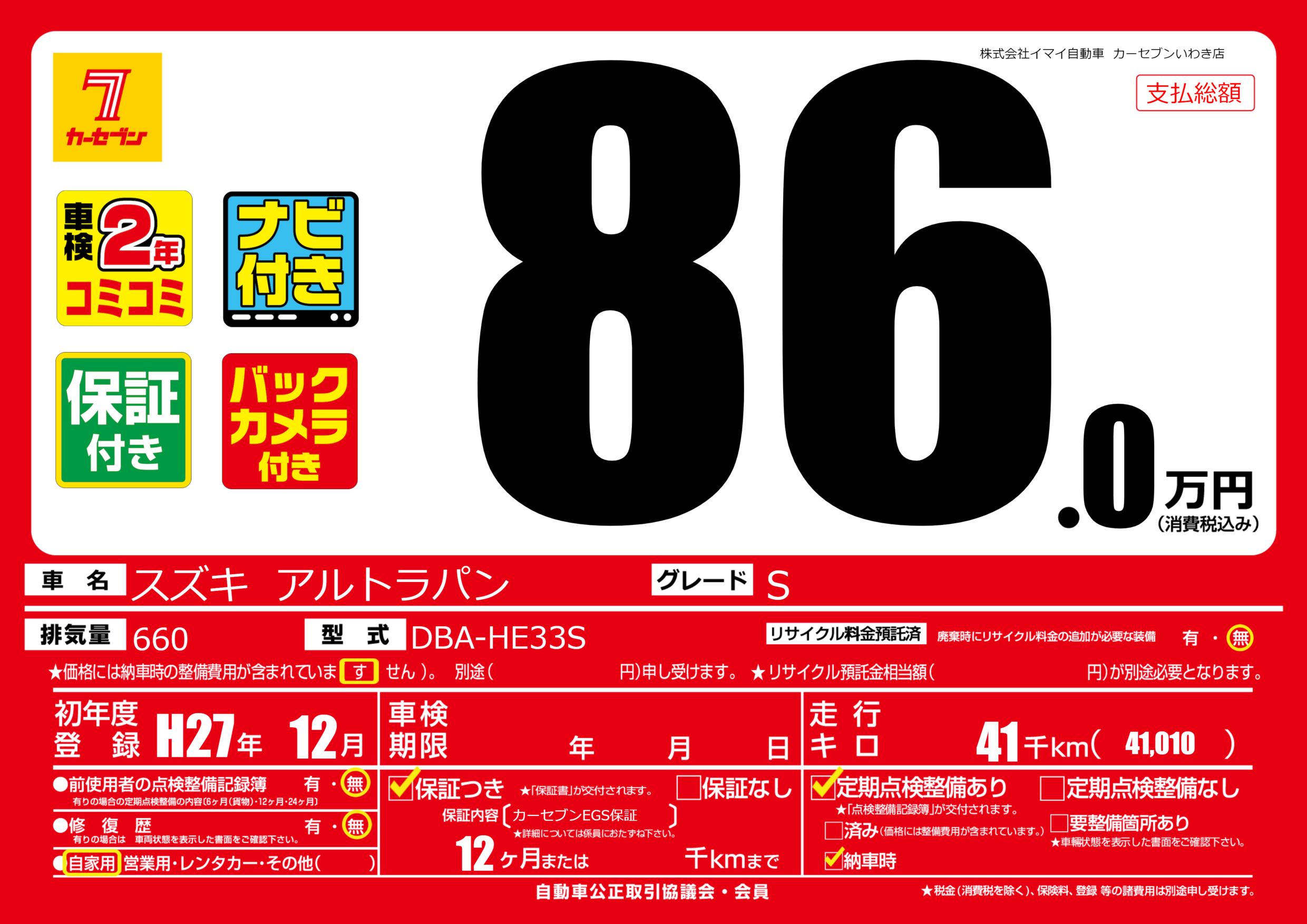 | 定期点検整備 | 定期点検整備あり 納車時あり | ||