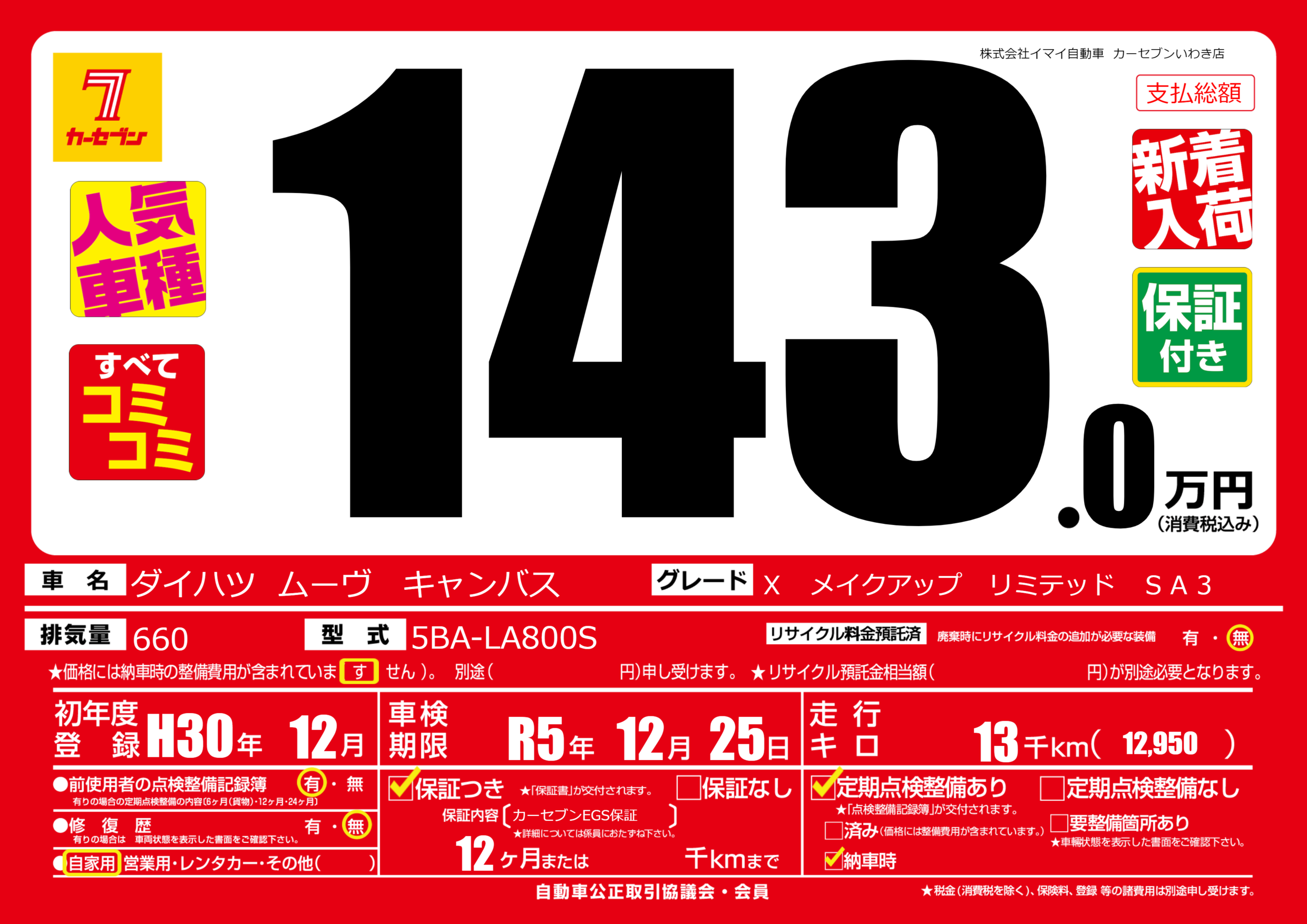 | 走行キロ | 1.3万km | 初年度登録 | H30年12月 |