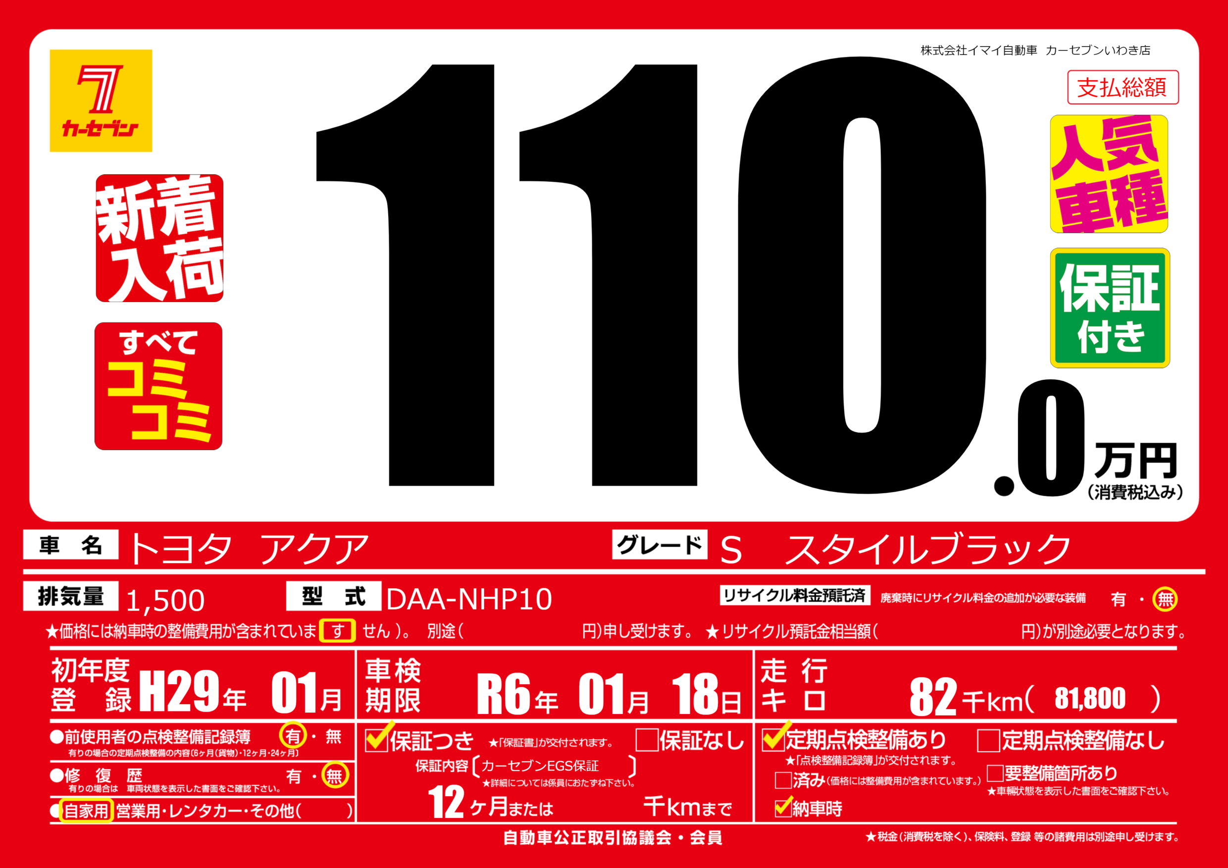 | 車名 | トヨタ アクア | グレード ミッション 排気量 |