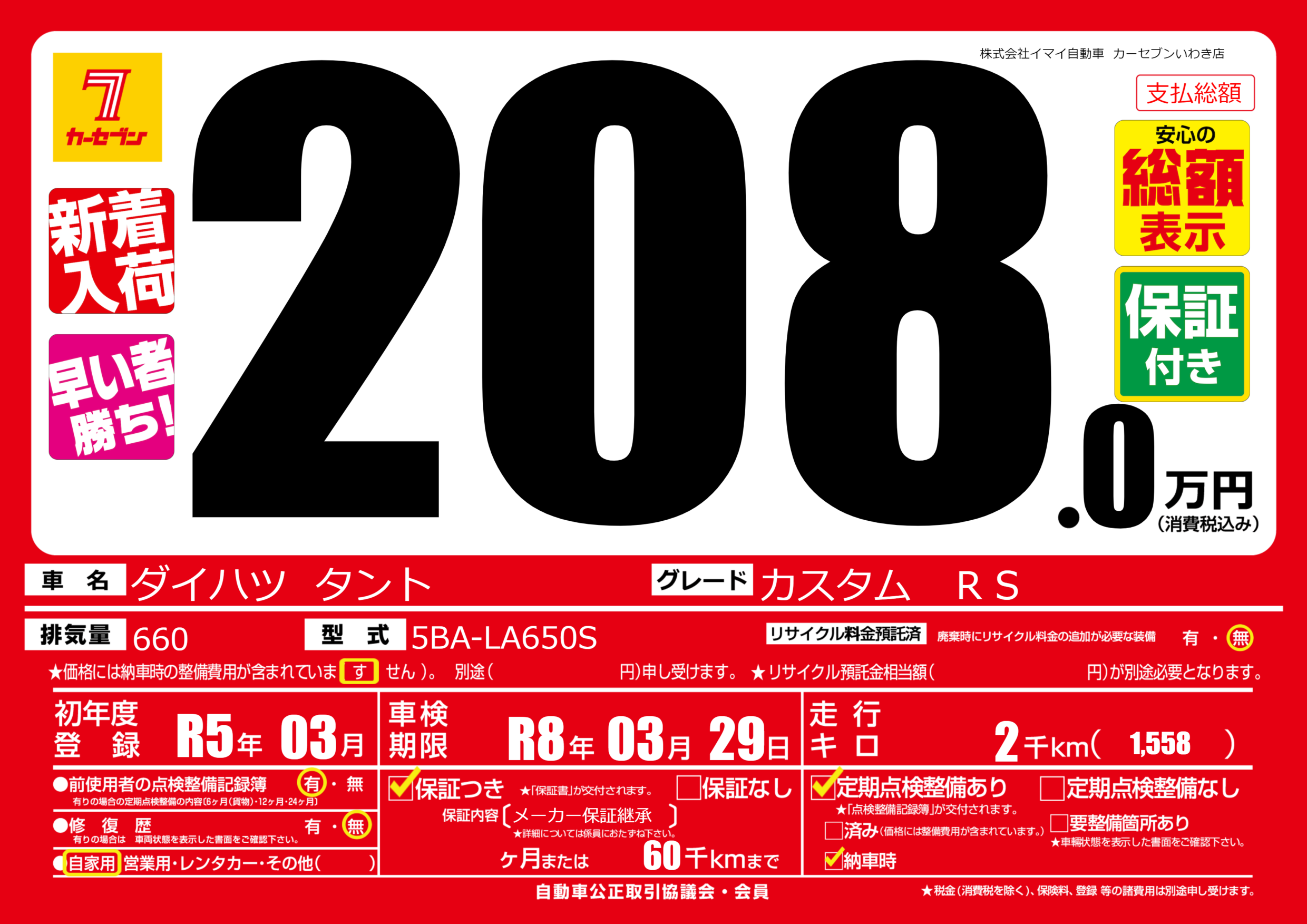 | 車検制限 | R8年 03月 29日 | ||