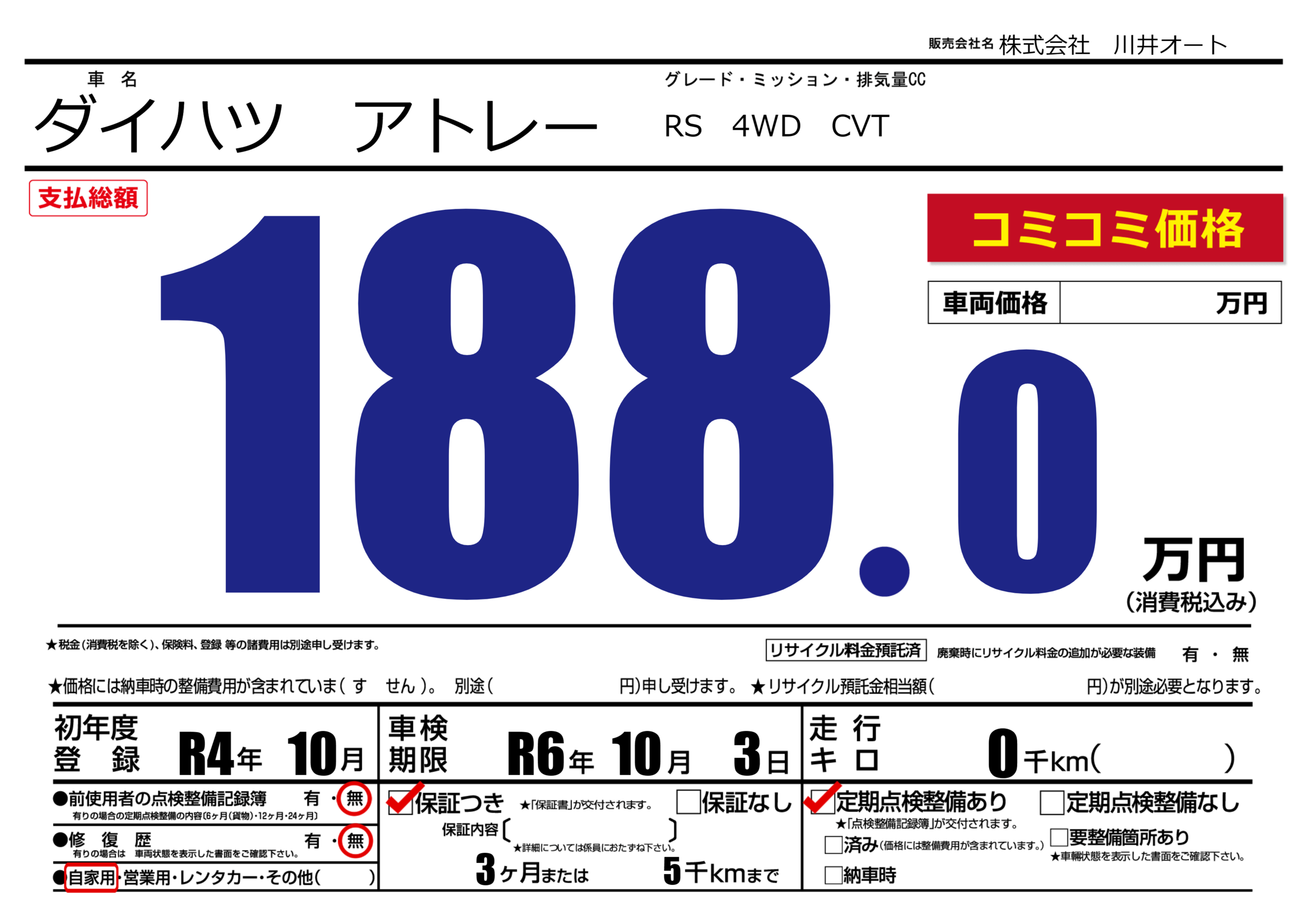 | 車名 | ダイハツ アトレー | グレード ミッション 排気量 |